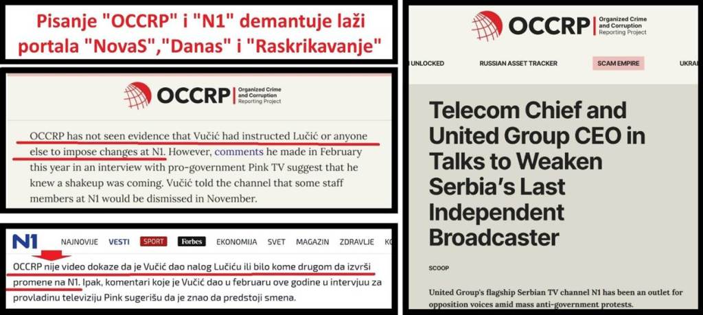 Sva četiri medija „N1“, „NovaS“, „Danas“ i „Raskrikavanje“ se pozivaju na vest na portalu „OCCRP“. Tu glavnu laž, uopšte ne pominje portal „N1“, niti osnovni izvor vesti, a to je portal „OCCRP“. U tekstu na portalu „OCCRP“, koji je objavljen samo na engleskom jeziku, pod naslovom „Telecom Chief and United Group CEO in Talks to Weaken Serbia’s Last Independent Broadcaster“ – jasno stoji da se predsednik Vučić nije mešao u promene u Junajted grupi, Junajted mediji ili na TVN1. U tekstu na portalu „OCCRP“, jasno stoji sledeće: „OCCRP has not seen evidence that Vučić had instructed Lučić or anyone else to impose changes at N1“ („OCCRP nije video dokaz da je Vučić naložio Lučiću ili bilo kome drugom da nametne promene na N1“).