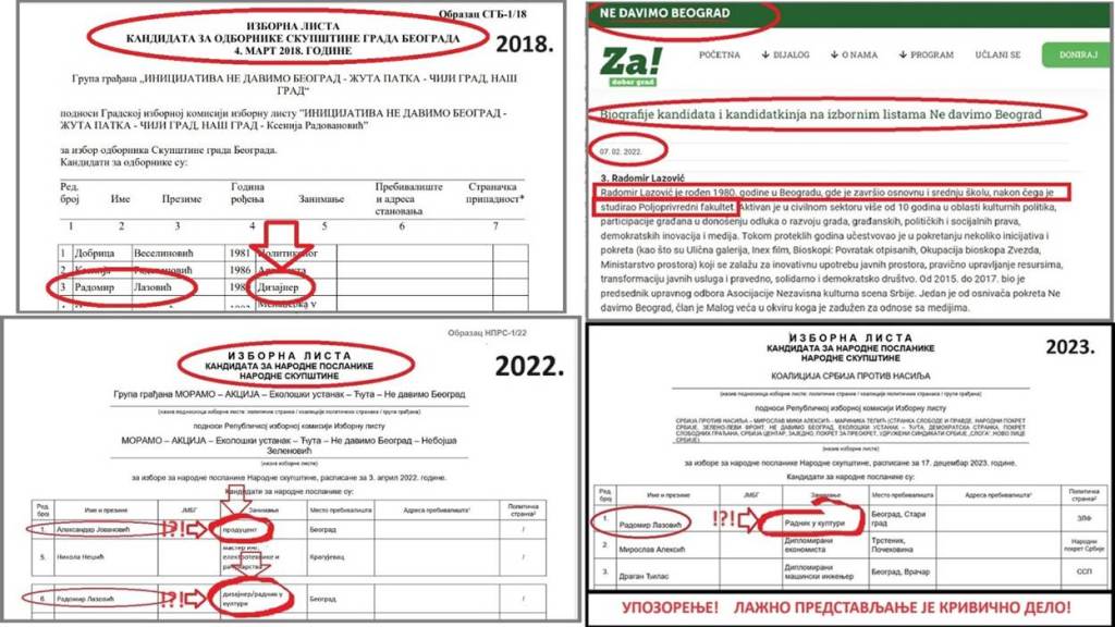 Lazović se 2018. 2022. i 2023. lažno predstavljao na listama svoje stranke i koalicije. On je kao svoje zanimanje 2018. na listi za Beograd naveo „dizajner“. Lazović je 2022. na listi koalicije „Moramo“ naveo kao svoje zanimanje „dizajner/radnik u kulturi“. Lazović je 2023. na listi koalicije „Srbija protiv nasilja“ naveo kao svoje zanimanje „radnik u kulturi“. Kao što vidite Lazović je u tri izborna ciklusa tri puta slagao birače i lažno se predstavljao sva tri puta, želeći da prikrije da je završio srednju školu, a ne fakultet, i u želji da prikrije da nije završio Poljoprivredni fakultet koji je studirao, i da prikrije činjenicu da je i dalje student od 45 godina. Lazović već godinama najsramnije obmanjuje građane i birače, lažno se predstavljajući. Istina je da je Radomir Lazović završio Devetu gimnaziju. Lazović u svojoj biografiji na sajtu „Ne davimo Beograd“ u rubrici „Biografije kandidata i kandidatkinja na izbornim listama Ne davimo Beograd“ od 07. 02. 2022., navodi sledeće: „završio osnovnu i srednju školu, nakon čega je studirao Poljoprivredni fakultet“. Iz ovoga je jasno da je Lazović završio srednju školu, i da nije završio Poljoprivredni fakultet. Lazović ima 45 godina. U rubrici zanimanje je morao da navede „student poljoprivrede“. Lazović studira već 26 godina. Istina je da je Radomir Lazović položio ukupno 8 ispita sa prosečnom ocenom 7,13. Prosečno je Lazović za 26 godina studiranja, polagao jedan ispit u tri godine!!! Upozoravam Lazovića de je lažno predstavljanje krivično delo. Pre nego što je postao poslanik, Radomir Lazović je bio nezaposleno lice, besposličar skvoter angažovan u raznim antisrpskim NVO. Lazović je svoje prve dane radnog staža, upisao u radnu knjižicu, kao narodni poslanik. Država Srbija i Aleksandar Vučić, koje Lazović toliko pljuje, su zaposlili Radomira Lazovića, prvi put u njegovom životu. Lazović je 4. marta 2025. godine, u salu Skupštine Srbije (spomenik kulture), uneo aparat za gašenje požara koji je ispraznio u sali koju je uništio. Lazović je tada uneo i dimne bombe i suzavac koje je bacao po poslanicima SNS, kada je povredio Jasminu Obradović, koja je dobila moždani udar, i kada je povredio Sonju Ilić, u osmom mesecu trudnoće, ugrozivši i njen život i život njenog nerođenog deteta. To je Radomir Lazović!