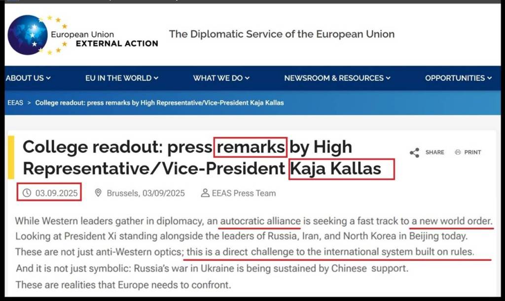 Visoka predstavnica Evropske unije za spoljnu politiku Kaja Kalas izjavila je 03.09.2025 da predsednici Kine, Rusije, Irana, Severne Koreje i drugih država, okupljeni u Pekingu, predstavljaju „autokratski savez“ (autocratic alliance) koji dovodi u pitanje međunarodni poredak zasnovan na pravilima. Kaja Kalas je rekla: „Dok se zapadni lideri diplomatski okupljaju, autrokratski savez traži brz put ka novom svetskom poretku. Gledajući predsednika Sija kako stoji pored lidera Rusije, Irana i Severne Koreje, danas u Pekingu. Ovo nije samo antizapadna optika; to je direktan izazov međunarodnom sistemu zasnovanom na pravilima. I to nije samo simbolika: Ruski rat u Ukrajini je neprekidan zbog Kineske podrške. To su realnosti sa kojima Evropa mora da se suoči“. („While Western leaders gather in diplomacy, an autocratic alliance is seeking a fast track to a new world order. Looking at President Xi standing alongside the leaders of Russia, Iran, and North Korea in Beijing today. These are not just anti-Western optics; this is a direct challenge to the international system built on rules. And it is not just symbolic: Russia’s war in Ukraine is being sustained by Chinese support. These are realities that Europe needs to confront“).