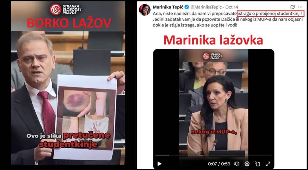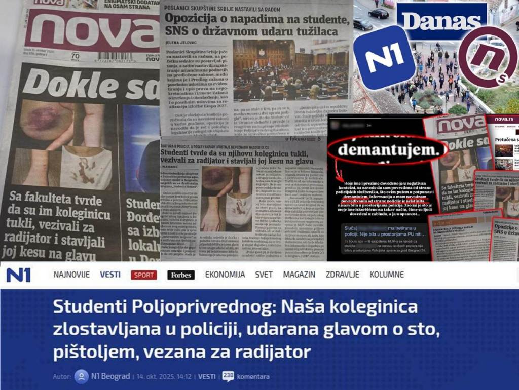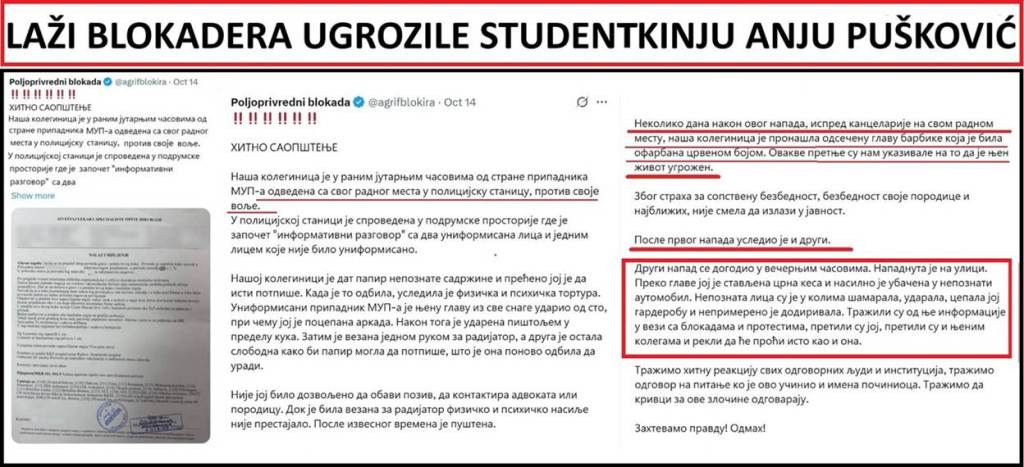 Administrator ili administratori stranice na X platformi i na Instagramu – „Poljoprivredni u blokadi“ su 14.10.2025. u 13:56 časova, u dogovoru sa opozicijom, namerno plasirali lažnu vest, spin o nekoj neimenovanoj studentkinji koju je pretukla policija. Spin, monstruozna laž je lansirana iz više razloga. Prvo, zbog dolaska predsednice EK, Urule fon der Lajen, tog dana. Drugo, u cilju „pumpanja“ javnosti pred 1. novembar, kada blokaderi i opozicija najavljuju nasilje. Nepoznato je ko je administrator ili ko su administratori te dve stranice na X-u i Instagramu. To može biti bilo ko, neki student blokader, neki profesor blokader, ili neki pripadnik opozicije – blokader, ili više njih. Administrator je počinio više krivičnih dela. Tužilaštvo za visoko tehnološki kriminal treba da utvrdi ko je taj administrator (i), i da ga goni po službenoj dužnosti. Međutim, glavni tužilac za visoko tehnološki kriminal je Boris Majlat, takođe blokader, koji neće preduzeti ništa.