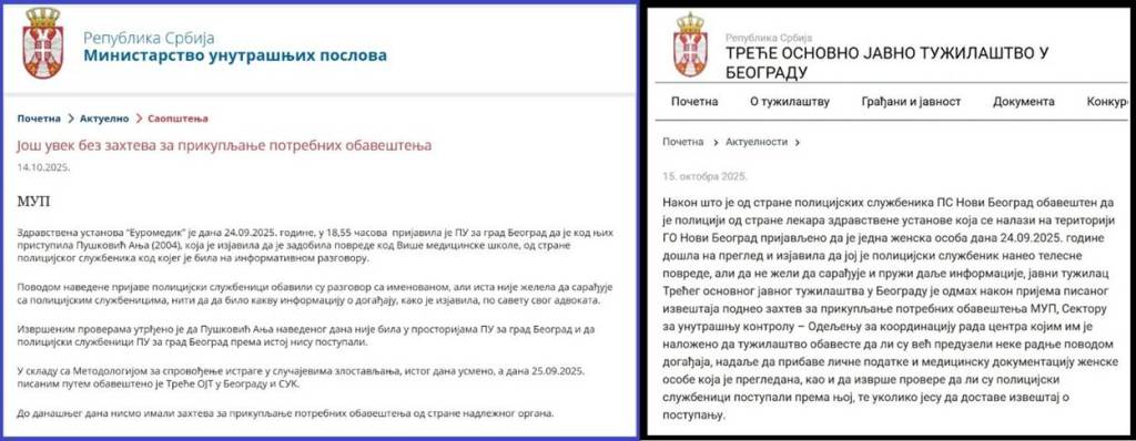 Ministarstvo unutrašnjih poslova je nekoliko sati posle toga saopštilo: „Zdravstvena ustanova „Medigrup” je dana 24.09.2025. godine, u 18,55 časova prijavila je PU za grad Beograd da je kod njih pristupila Pušković Anja (2004), koja je izjavila da je zadobila povrede kod Više medicinske škole, od strane policijskog službenika kod kojeg je bila na informativnom razgovoru. Povodom navedene prijave policijski službenici obavili su razgovor sa imenovanom, ali ista nije želela da sarađuje sa policijskim službenicima, niti da da bilo kakvu informaciju o događaju, kako je izjavila, po savetu svog advokata. Izvršenim proverama utrđeno je da Pušković Anja navedenog dana nije bila u prostorijama PU za grad Beograd i da policijski službenici PU za grad Beograd prema istoj nisu postupali. U skladu sa Metodologijom za sprovođenje istrage u slučajevima zlostavljanja, istog dana usmeno, a dana 25.09.2025. pisanim putem obavešteno je Treće OJT u Beogradu i SUK. Do današnjeg dana nismo imali zahteva za prikupljanje potrebnih obaveštenja od strane nadležnog organa“.