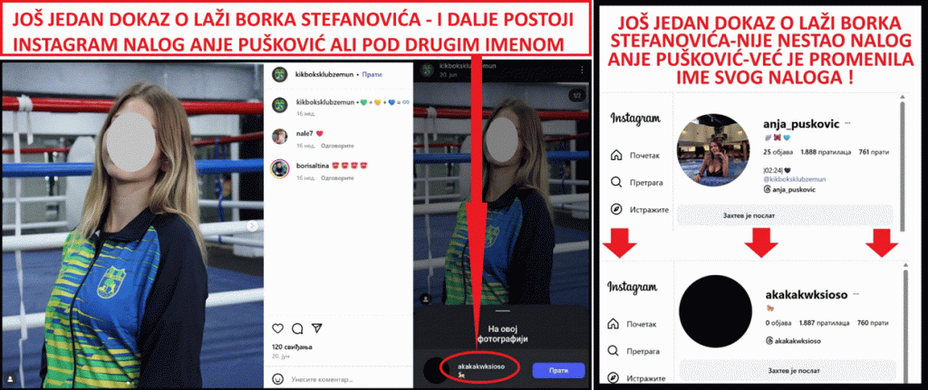 Tog dana je notorni lažov, potpredsednik Đilasove stranke SSP, Borko Stefanović, u Skupštini Srbije, u neuspelom pokušaju da se opere od laži koju je izgovorio prehodnog dana, lansirao novu laž da je nestao ili ugašen Instagram profil Anje Pušković, i insinuirao je da je ona mafijaškim metodama naterana da objavi demanti laži Borka Stefanovića i ostalih blokadera i opozicionara. Mediji i javnost su lako utvrdili da nije ugašen ili nestao profil Anje Pušković, već da je ona sama promenila korisničko ime svog Instagram profila iz „Anja_Puskovic“ u „akakakwksiozo“. Time je demantovana još jedna laž Borka Stefanovića. Takođe je utvrđeno da je Anja Pušković, sportistkinja, članica kikboks kluba „Zemun“ gde se mogu naći njene fotografije. Ovo je značajno zbog toga što daje mogući odgovor odakle povrede Anji Pušković. Kikboks je nasilan borilački sport, gde se zadaju udarci i rukama i nogama, u glavu i u telo. Anja Pušković u svom demantiju ne pominje da li je ikada zadobila pomenute povrede ili nije.