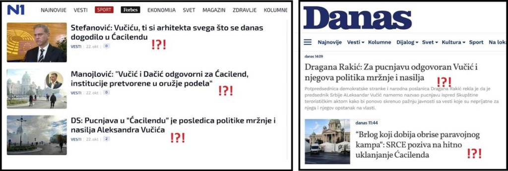 Iz svega što sam naveo, vidi se da imamo jasno dobrovoljno priznanje teroriste Vladana Anđelkovića o izvršenom zločinu. Potom imamo jasna saopštenja policije i tužilaštva. Takođe, predsednik Republike Srbije, Aleksandar Vučić je u 13 časova 22.10.2025. godine, održao konferenciju za štampu, gde je istakao ključne činjenice, i gde je prikazan snimak priznanja teroriste. Dakle, već do 14 časova 22.10.2025. godine, bile su poznate sve najvažnije činjenice – a to je da se radi o oružanom terorističkom napadu blokadera na Ćacilend, zbog neslaganja sa tim prijavljenim skupom, i sa njegovim učesnicima, koje je pokušao da pobije i zapali. Nije postojala ni trunka sumnje o čemu se tu radi. Bez obzira na to, pripadnici opozicije i blokadera su počeli namerno da daju idiotske izjave, koje veze nemaju sa istinom. Kao i uvek namera je bila da se seju laži i spinovi, da bi se prikrila činjenica da je njihov pripadnik i simpatizer, pokušao da ubija i spaljuje političke neistomišljenike. To su činili putem društvenih mreža i svojih medija TVN1, TV NovaS, njihovih portala, i portala Danas i Direktno.
