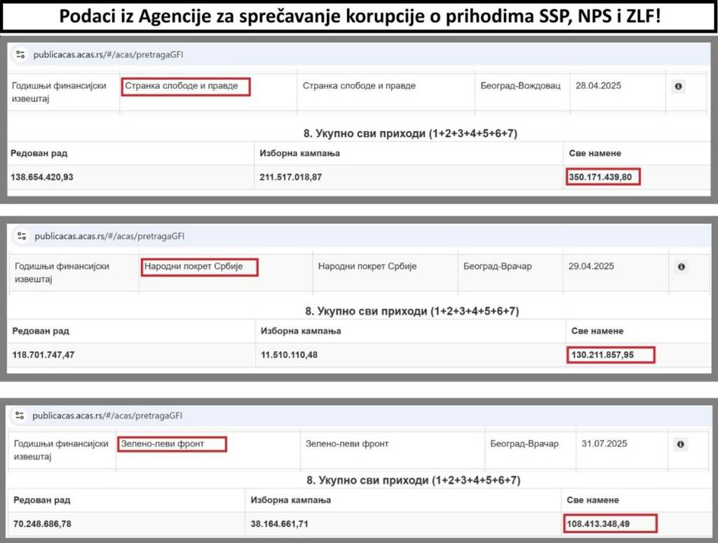 U poslednjih 12 meseci, antisrpske i antidržavne opozicione stranke su iz inostranstva, nekonito, u kešu dobile minimum 100 miliona dolara za rušenje Srbije, od onih 4 milijarde koje pominje predsednik Vučić. Te stranke i pokreti su: Stranka slobode i pravde, Proglas, Narodni pokret Srbije, Zeleno-levi front, Demokratska stranka, Mi-Nestorović, Nova demokratska stranka Srbije, SRBIJA CENTAR, Pokret obnove kraljevine Srbije, Pokret slobodnih građana, Novo lice Srbije, Kreni-promeni, Ekološki ustanak, Miša Bačulov, Dveri, Narodne patrole, Srpski zbor, Stav, Sviće, Bravo itd. Nabrojao sam 20 antisrpskih i antidržavnih stranaka ili pokreta. Neregistrovana stranka „Studenti u blokadi“ je poseban slučaj i oni su dobijali najviše novca, mimo ostatka opozicije. Oni su dobili značajan deo novca koji je pominjao predsednik Vučić. Raspodela 100 miliona dolara za 20 pomenutih opozicionih stranaka i pokreta je bila nejednaka, naravno. Najviše novca su dobili u kešu (ovim redosledom) Proglas (20), Kreni-promeni (19), SSP (15), NPS (12), ZLF (10), DS (6), SC (6), Mi-Nestorović (2), PSG (2), DSS (2), Ekološki ustanak (1), NLS (1), Bačulov (1), Stav (0,5), Sviće (0,5), Bravo (0,5) itd. Ostale, uglavnom desničarske opozicione stranke su zajedno dobile oko 1,5 miliona dolara.