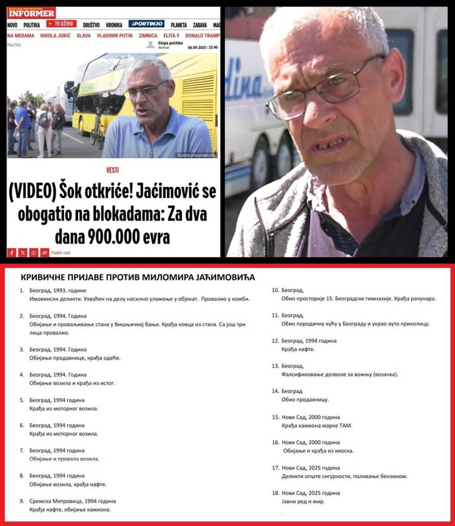 Mali dokaz o delu uloženog novca u rušenje Srbije. Većina medija je 06.09.2025., izvestila da je Milomir Jaćimović, priznao da je dobio 900.000 evra za dan i po. Auto-prevoznik Milomir Jaćimović, poznat po nasilju i blokadama, priznaje na snimku da je od navodnih donacija blokadera, dobio 900.000 evra za dan i po dok je bio u pritvoru. U telefonskom razgovoru, Jaćimović se hvali da je od građana i međunarodnih donatora primio 41.800.000 dinara, 91.000 dolara i uplatu iz Amerike, što ukupno dostiže oko 900.000 evra. Jaćimović na snimku kaže: „Ja sam druže dobio donacija za dva i po dana, skoro 900.000 evra. Dobio sam što sam dobio u parama, sad ću ti reći, ja to ne krijem, ja to javno kažem“. Jaćimović nije platio porez na ovaj prihod, čime je počinio novo krivično delo! Prevoznika je bilo mnogo – prevezli su blokadere na 2000 skupova. Samo jedan prevoznik je priznao da je za dan i po zaradio 900.000 evra, navodno u donacijama. Svi prevoznici su plaćeni, verovatno istim „donacijama“ kao i Jaćimović, i izvesno nisu platili porez na tu zaradu.
