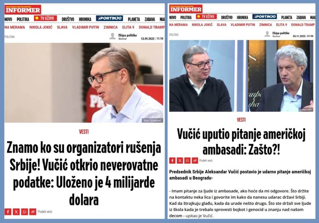 Predsednik Vučić je 13.09.2025. bio gost TV Informer gde je govorio i o organizatorima i finansijerima pokušaja izazivanja krvave obojene revolucije i građanskog rata u Srbiji: „Znamo bar tri zemlje da su se posebno angažovale i njihove obaveštajne mreže. Primoran sam da ne izgovorim, zato što bih time srušio poziciju Srbije i njene neutralnosti i prema tim zemljama, a te zemlje znaju da mi znamo da one to sprovode. Uloženo je 4 milijarde dolara u rušenje Srbije. Reč je ovde o velikim silama. Vidite koliko troše N1 i Nova S, pa vidite odakle je sve to finansirano i biće vam sve jasno“.