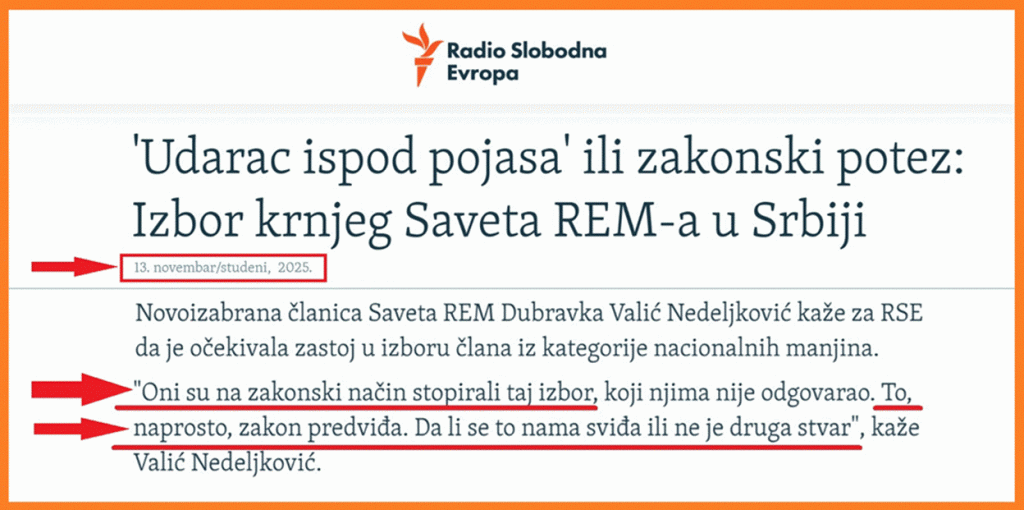 „Radio slobodna Evropa“ (RSE) – koji je objavio tekst pod naslovom „Udarac ispod pojasa ili zakonski potez: Izbor krnjeg Saveta REM-a u Srbiji“. U tom tekstu stoji izjava Dubravke Valić Nedeljković: „Oni su na zakonski način stopirali taj izbor, koji njima nije odgovarao. To, naprosto, zakon predviđa. Da li se to nama sviđa ili ne je druga stvar. Te odluke nepotpunog Saveta su, naravno, krnje, ali ako nema druge, onda se tako funkcioniše. Šta ako za nekog od tih osam članova – bez obzira sa koje strane – mi smatramo da je to baš dobra osoba za predsednika i glasamo za njega. To nije nemoguće. Četiri prema četiri je pozicija da svako sprovede svoje prioritete ili da se ne sprovede ništa“. Kao što vidite 13.11.2025. godine, izabrana članica Saveta REM, Đilasova „nezavisna“ kandidatkinja Dubravka Valić Nedeljković jasno kaže da je osam članova Saveta REM izabrano na zakonit način, i još važnije kaže da jedan član nije izabran, na takođe zakonit način. Ona jasno kaže da i tako može da funkcioniše Savet REM. Dan kasnije 14.11.2025. godine, Đilas obaveštava gospođu Dubravku Valić Nedeljković da nije u pravu, i da mora da podnese ostavku. I gospođa Dubravka Valić Nedeljković „nezavisni“ kandidat, potpuno zavisan od Đilasa, postupa po Đilasovoj komandi i podnosi ostavku.