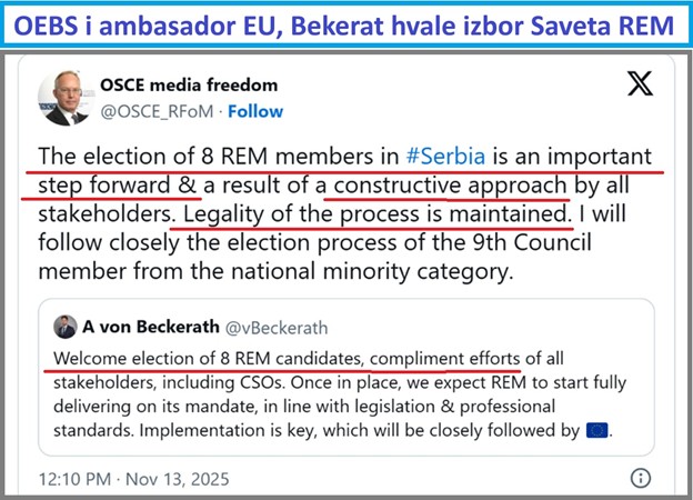Da je ceo proces izbora Saveta REM, validan, zakonit, legalan i legitiman, tvrde i EU i OEBS, i poimence predsednica Evropske komisije Ursula fon der Lajen, i ambasador EU u Srbiji Andreas fon Bekerat. „Pozdravljamo izbor osam kandidata za REM i čestitamo svim učesnicima procesa, uključujući organizacije civilnog društva. Kada budu stupili na dužnost, očekujemo da REM počne da u potpunosti sprovodi svoj mandat, u skladu sa zakonodavstvom i profesionalnim standardima. Ključna je implementacija, koja će biti pažljivo praćena od strane Evropske unije“ – saopštio je 12.11.2025. godine, ambasador EU u Srbiji Andreas fon Bekerat. „Izbor osam članova REM-a u Srbiji predstavlja važan korak napred i rezultat konstruktivnog pristupa svih aktera. Zakonitost procesa je očuvana. Pažljivo ću pratiti proces izbora devetog člana Saveta iz kategorije nacionalnih manjina“, saopštio je OEBS 13.11.2025. godine. Ranije, 15.10. 2025., godine, predsednica Evropske komisije Ursula fon der Lajen izjavila je posle razgovora sa predsednikom Srbije Aleksandrom Vučićem: „Pozdravljam proces u vezi sa ažuriranim biračkim spiskom i to što je postignut dogovor o Savetu REM-a“.