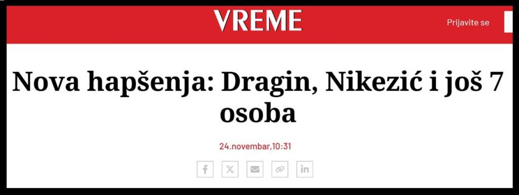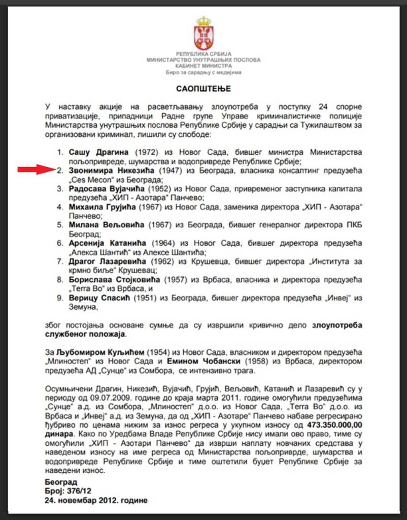 4. Zvonimir Nikezić, finansijski konsultant, hapšen je pod optužbom za produženo krivično delo zloupotrebe položaja odgovornog lica u podstrekavanju, a u vezi sa aferom „Azotara“ Pančevo. Zvonimir Nikezić je otac Dušana Nikezića, potpredsednika Đilasove stranke SSP.
