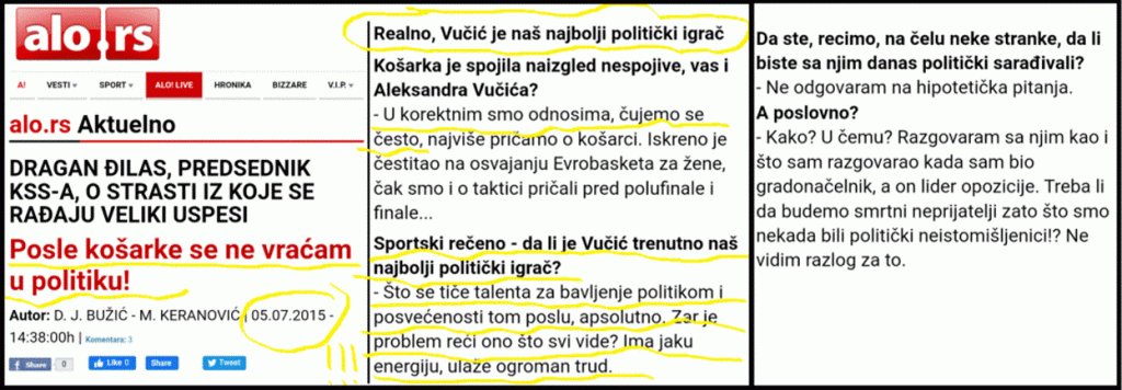 Četvrti put je Đilas hvalio Vučića u julu 2015. godine. Đilas je dao intervju listu „Alo“ 05.07.2015., u kome hvali Vučića. Tada je Đilas rekao:„Posle košarke se ne vraćam u politiku! Politika me ne zanima (…)“. O Vučiću je Đilas tada rekao:“U korektnim smo odnosima, čujemo se često (…)“. Na pitanje:“Da li je Vučić trenutno naš najbolji politički igrač?“, Đilas je odgovorio: “Što se tiče talenta za bavljenje politikom i posvećenosti tom poslu, apsolutno. Zar je problem reći ono što svi vide? Ima jaku energiju, ulaže ogroman trud“. Na pitanje novinara lista „Alo“-„Da li biste sa njim danas poslovno sarađivali?“, Đilas je odgovorio: „Razgovaram sa njim kao i što sam razgovarao kada sam bio gradonačelnik, a on lider opozicije. Treba li da budemo smrtni neprijatelji zato što smo nekada bili politički neistomišljenici!? Ne vidim razlog za to“.