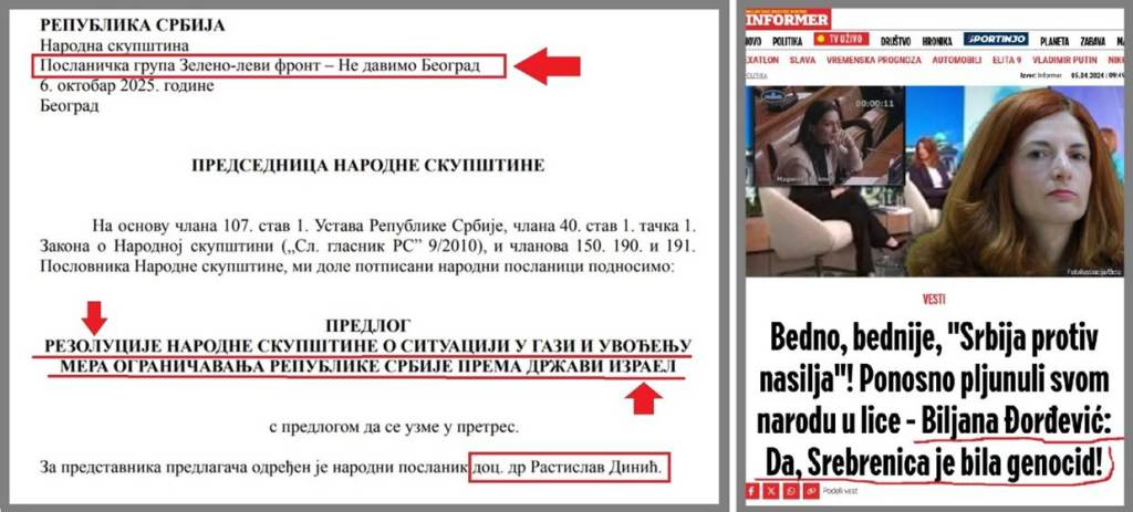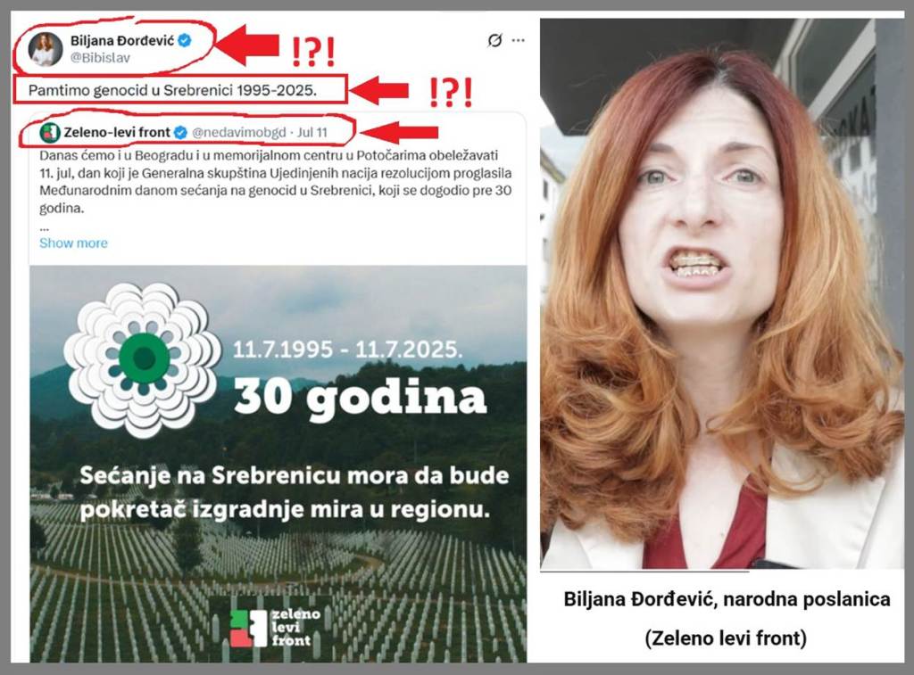 Tri političke grupe – „Studenti u blokadi“, Zeleno levi front (ZLF) i Stranka demokratske akcije (SDA), osim što su antisemiti i što podržavaju teroristički Hamas, što pozivaju na istrebljenje Izraelaca, i osim što proglašavaju jevrejski narod genocidnim, poznati su i po izrazitom antisrpstvu, i po tome što Srbe optužuju da su počinili genocid u Srebrenici, i shodno tome ove tri političke grupacije i Srbe žigošu kao genocidni narod. Da li je potrebno da naglasim da ne postoji genocid u Srebrenici i Gazi.