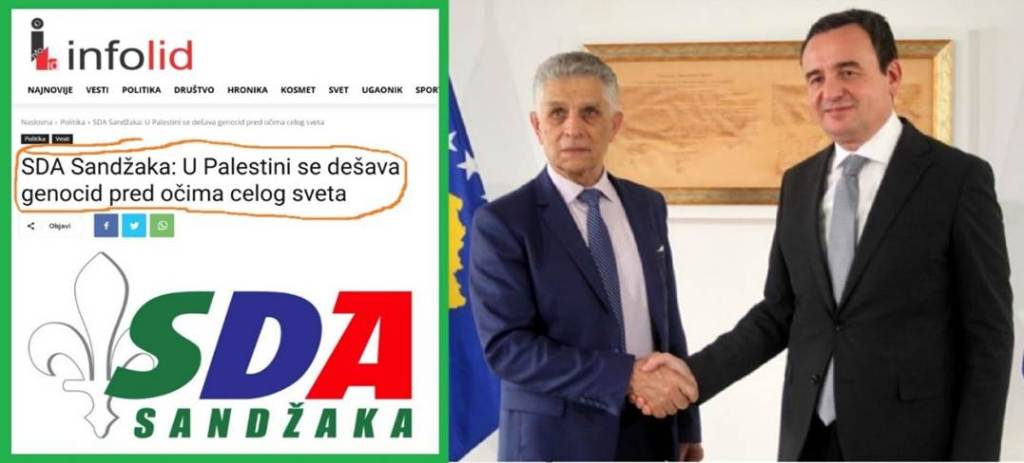 Treći antisemitski faktor u Srbiji je islamska ekstremistička stranka SDA Sandžaka. Ta stranka je polufašistička, polu teroristička. Oni su npr. već 19.10.2023. godine, objavili saopštenje u kome optužuju Izrael za genocid. Saopštenje ima naziv: „SDA Sandžaka: U Palestini se dešava genocid pred očima celog sveta“. U tom saopštenju stoji: „Stranka demokratske akcije Sandžaka osudila je ubijanje civila u Palestini i napad Izraela na bolnicu u Gazi. Kao parlamentarna stranka koja štiti i zastupa interese građana Sandžaka i Bošnjaka u Republici Srbiji najoštrije osuđujemo svakodnevne napade oružanih snaga Izraela i ubijanje civilnog stanovništva u Palestini. Posebno osuđujemo smrtonosni izraelski napad na bolnicu u pojasu Gaze, gde je ubijeno preko 700 civila i ranjen veliki broj nedužnih ljudi, što je zločin protiv čovečnosti i poprima razmere genocida nad Palestincima u Gazi. Bošnjaci su narod nad kojim je počinjen genocid, mnogi zločini u Sandžaku i žrtve su organizovanog državnog terora u Srbiji te najbolje razumeju današnju sudbinu nedužnog civilnog stanovništva u Palestini. SDA Sandžaka je protiv upotrebe sile i nasilja za nametanje političkih rešenja i ostvarenje političkih ciljeva“.