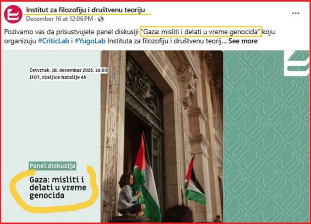 Vrhunac svega ovoga predstavlja Predlog rezolucije Narodne skupštine o situaciji u Gazi i uvođenju mera ograničavanja Republike Srbije prema državi Izrael (koju su predložli poslanici ZLF – opaska N.B.) u kojoj piše da izraelske snage u Pojasu Gaze sprovode genocid. Kada bi predlog bio usvojen, ovaj narativ na koji ukazujemo sa zebnjom, bi se odomaćio u našem društvu, a posledice bi mogle biti nesagledive.