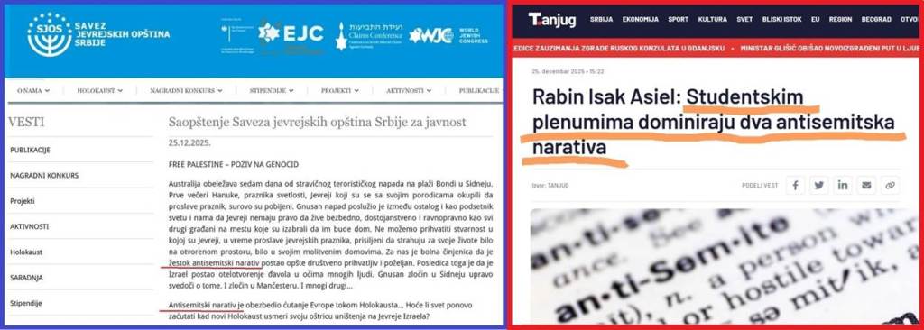 Predsednik Radnog odbora Saveza jevrejskih opština Srbije (SJOS), rabin Srbije, gospodin Isak Asiel je objavio 25.12.2025. godine, autorski tekst, saopštenje, u ime Saveza jevrejskih opština Srbije, na sajtu tog Saveza. Tekst rabina Isaka Asijela ima naslov „FREE PALESTINE – POZIV NA GENOCID“. Rabin Srbije, gospodin Isak Asiel ukazuje da je u svetu, „antisemitski narativ postao opšte društveno prihvatljiv i poželjan“, i kritikuje jasan antisemitizam studentskih blokaderskih plenuma i prikazuje dokaze za to u obliku različitih saopštenja i objava, mnogobrojnih uticajnih plenumaških stranica- naloga, npr. plenuma studenata u blokadi Fakulteta dramskih umetnosti, plenuma studenata Arhitektonskog fakulteta u blokadi, plenuma studenata u blokadi Fakulteta primenjenih umetnosti, plenuma studenata Filozofskog fakulteta u blokadi i Instituta za filozofiju i društvenu teoriju.