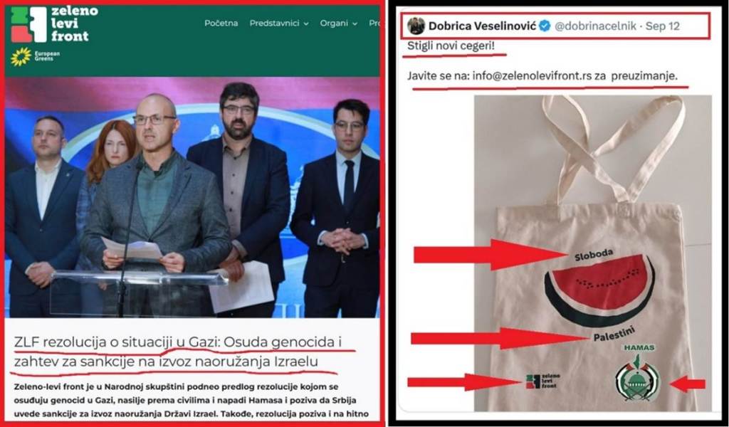 Dobrica Veselinović, poslanik ZLF je 12.09.2025. godine, na svom „X“ nalogu reklamirao poklanjanje cegera – platnenih torbi koje je nabavio ZLF, na kojima piše „Sloboda Palestini” i na kojima stoji znak Hamasa. Zeleno levi front nikada nije imao akciju i cegere – „Sloboda Srbima na KiM“ ili „Sloboda Kosovu i Metohiji“! Antisrpski ZLF nema saosećanje za Srbe na KiM. Program ZLF predviđa priznanje lažne države Kosovo! ZLF ima empatiju za Palestince, ali nema za Srbe! Ne treba zaboraviti da je Dobrica Veselinović bio pripadnik neonacističke grupe skinheds i promoter rasističke grupe „Cokule“.