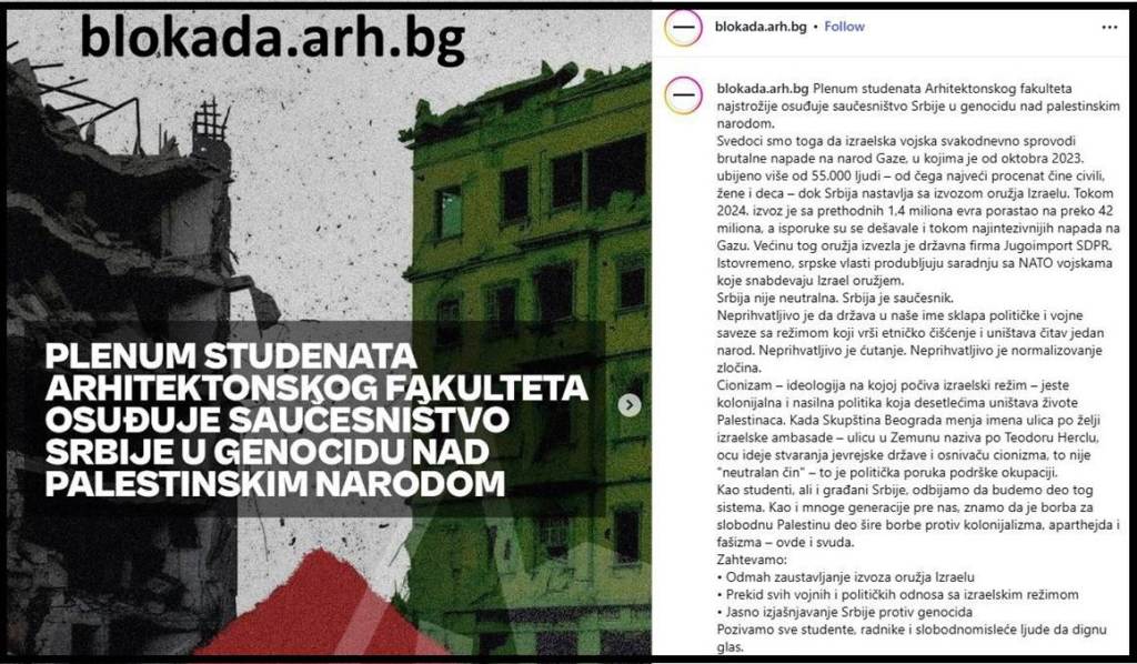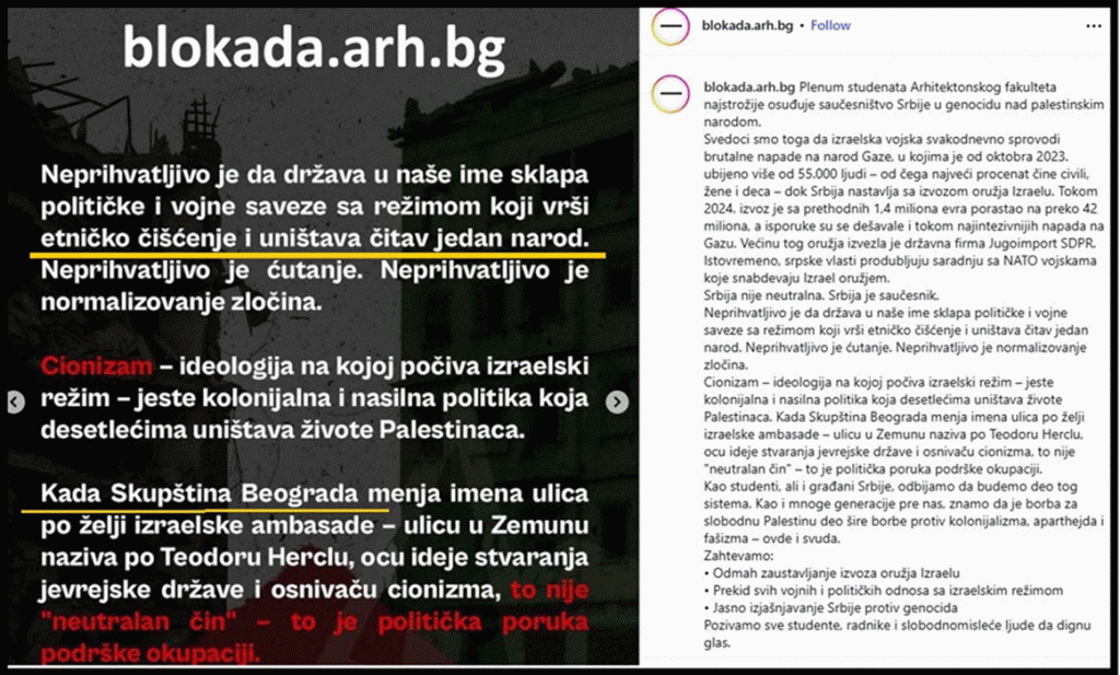 Plenum studenata Arhitektonskog fakulteta govori o tome da je borba za slobodnu Palestinu deo šire borbe protiv kolonijalizma, aparthejda i fašizma – ovde i svuda. Plenum zapravo govori o globalizaciji te borbe, ovde – u Srbiji i svuda – na svetskom nivou, npr. u Australiji. Kakav sunovrat ovog i drugih studentskih Plenuma! Slogan From the river to the sea, Palestine will be free, ili skraćeno Free Palestine odnosi se na istrebljenje Jevreja odnosno potpunu eliminaciju Izraela. To je poziv na genocid“.