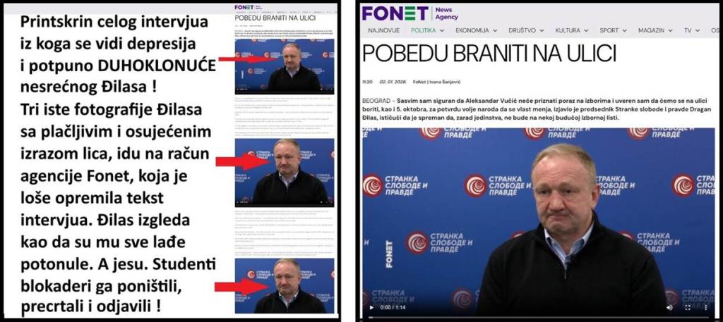 Đilas je 2.1.2026. dao intervju agenciji Fonet. Fonet, što je čudno, nije objavio tekst intervjua na svom sajtu, već je prepričao intervju, uz tri kratka video snimka u ukupnom trajanju od 3 minuta (tri snimka od minut). Fonet je, kad otvorite intervju, prikazao 3 iste Đilasove slike (početak svakog video snimka) koje pokazuju potpuno Đilasovo duhoklonuće. Sva tri video snimka su mračna, depresivna, a Đilas izgleda kao da su ga krave žvakale, crven, sa višestrukim podočnjacima, izboran, izgužvanog lica. Govor tela odražava poraženog čoveka. Uobičajeno, vidi se da Đilas ne živi u stvarnosti, već u svom virtuelnom balonu, u kome halucinira jednako kao i blokaderi sa „studentske liste“ koji su ga ponizili, poništili, ugasili i odjavili.