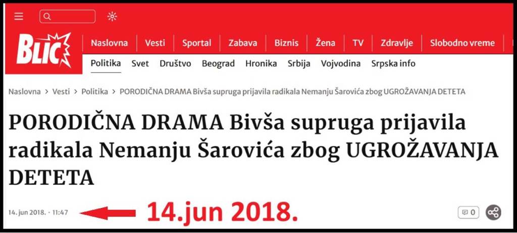 Druga vest je informacija lista „Kurir“ od 13.06.2018., pod naslovom „POMOZITE! NEMANJA ŠAROVIĆ SE IŽIVLJAVA NAD DETETOM: Bivša žena radikala traži zaštitu!“ u kojoj se navodi da je bivši poslanik Nemanja Šarović mogao da ugrozi zdravlje sinu V.Š.(6) pošto je odbijao da da saglasnost da se dečak operiše, zbog svađe sa majkom deteta Aleksandrom Ilić, navodi se u nalazu Centra za socijalni rad. Tu vest su preneli i drugi mediji, npr. list „Alo“ pod naslovom „Nemanju Šarovića bivša supruga prijavila zbog ugrožavanja deteta“ i list „Novosti“ pod naslovom „LICEMERJE NEMANJE ŠAROVIĆA: Potplaćivao radnika za socijalni rad kako bi pisao izveštaj u njegovu korist“. Zbog čega propala NovaS, propali Šarović i propali ustaški mediji, ne pišu o ovom slučaju porodičnog nasilja iz 2016. godine, od pre 10 godina, o porodičnom nasilju koje je počinio njihov miljenik? Isti aršini moraju da važe i za miljenika propale NoveS, propalog Nemanju Šarovića i za D. Ašanina.