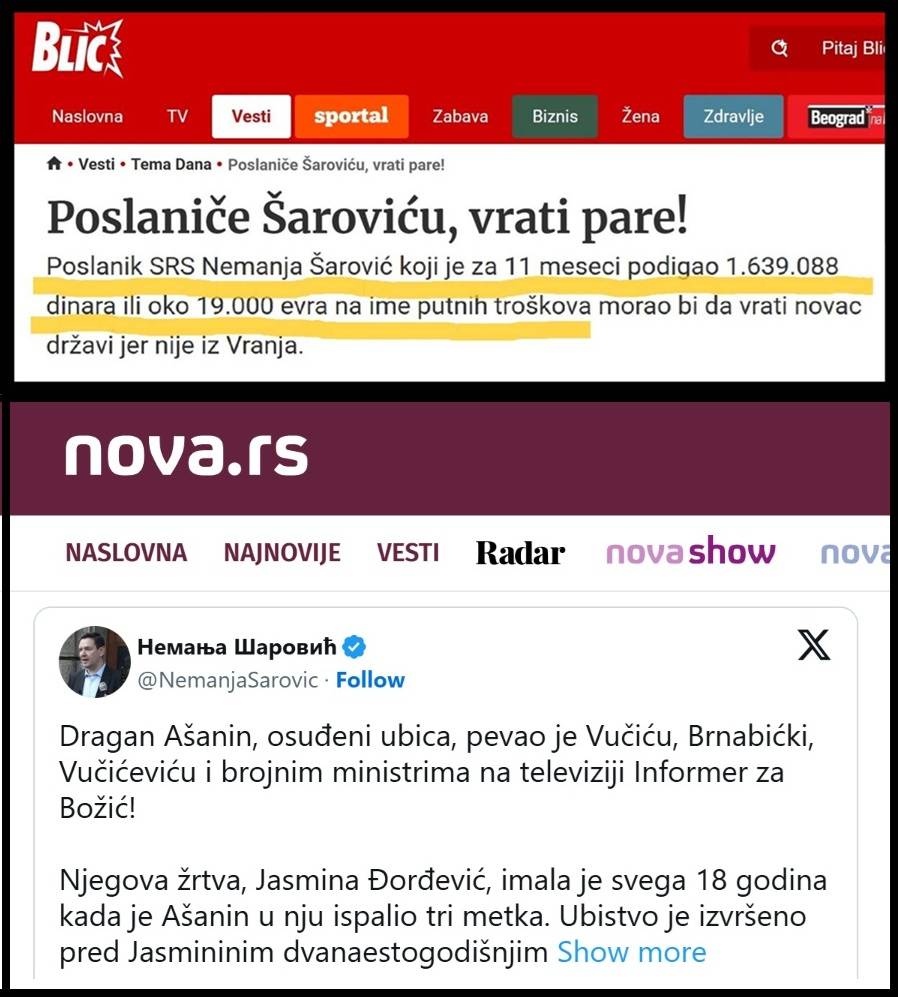 Navešću samo dva podatka, dve vesti iz medija koje jasno govore o krivičnim delima Nemanje Šarovića. Prva je vest lista „Blic“ od 24.12.2005. pod naslovom „Poslaniče Šaroviću, vrati pare!“ u kojoj se navodi da je poslanik Nemanja Šarović „uzeo“ tj. otuđio 1.639.088 dinara – 19.000 evra na ime lažnih putnih troškova! „Blic“ je tvrdio da Šarović mora da vrati novac državi jer nije iz Vranja. „Blic“ je navodio da je Šarović lažno prijavljivao da svakog dana putuje u Vranje, iako živi u Beogradu (Šarović je tada bio odbornik u opštini Stari grad)! O ovom slučaju su 2005. godine, pisali i drugi mediji. Zbog čega propala NovaS, propali Šarović i propali ustaški mediji, ne pišu o ovom slučaju krađe iz 2005. godine, od pre 21 godinu, o pljački koju je počinio njihov miljenik? Isti aršini moraju da važe i za miljenika propale NoveS, propalog Nemanju Šarovića i za D. Ašanina.