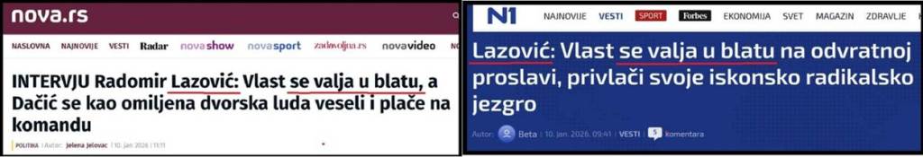 Radomir Lazović, kopredsednik stranke Zeleno levi front, student poljoprivrede od 46 godina, dao je intervju za propali medij NovaSS. U tom intervjuu večiti student kaže: „Vučić se vraća u svoje prirodne okvire. Da bi sačuvali radikalsko jezgro, moraju da se pred njima valjaju u blatu“. Lazović kritikuje i božićnu proslavu medijske kuće Informer.