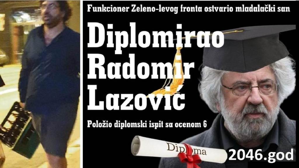 Večiti student Radomir Lazović kaže: „Zaista me ništa ne iznenađuje od Vučića, ali o njemu ni ne razmišljam“. Ovo je urnebesno smešno zbog toga što u dve trećine intervjua večiti student Lazović pominje predsednika Vučića, vređa ga, konfabulira. Lazović u intervjuu deset puta pominje Vučića. I onda Lazović kaže – „ali o njemu ni ne razmišljam“. Da. Lazović je opsednut Vučićem, ima teške komplekse. Kompleksa ima mnogo, ali prvi je to što Lazović mrzi Vučića zbog toga što je Vučić bio odličan student, što je na vreme završio Pravni fakultet. Radomir Lazović studira punih 27 godina Poljoprivredni fakultet, i Radomir Lazović je položio ukupno 8 ispita sa prosečnom ocenom 7,13. Prosečno je Lazović za 27 godina studiranja, polagao jedan ispit u tri godine!