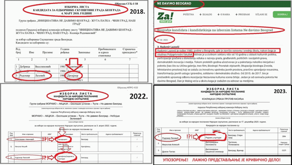 Lazović je više puta počinio krivično delo – lažno predstavljanje. Lazović se 2018. 2022. i 2023. lažno predstavljao na listama svoje stranke i koalicije. On je kao svoje zanimanje 2018. na listi za Beograd naveo „dizajner“. Lazović je 2022. na listi koalicije „Moramo“ naveo kao svoje zanimanje „dizajner/radnik u kulturi“. Lazović je 2023. na listi koalicije „Srbija protiv nasilja“ naveo kao svoje zanimanje „radnik u kulturi“. Kao što vidite Lazović je u tri izborna ciklusa tri puta slagao birače i lažno se predstavljao sva tri puta, želeći da prikrije da je završio srednju školu, a ne fakultet, i u želji da prikrije da nije završio Poljoprivredni fakultet koji je studirao, i da prikrije činjenicu da je i dalje student od 46 godina. Lazović već godinama najsramnije obmanjuje građane i birače, lažno se predstavljajući. Istina je da je Radomir Lazović završio Devetu gimnaziju. Lazović u svojoj biografiji na sajtu „Ne davimo Beograd“ u rubrici „Biografije kandidata i kandidatkinja na izbornim listama Ne davimo Beograd“ od 07. 02. 2022., navodi sledeće: „završio osnovnu i srednju školu, nakon čega je studirao Poljoprivredni fakultet“. Iz ovoga je jasno da je Lazović završio srednju školu, i da nije završio Poljoprivredni fakultet. Lazović ima 46 godina. U rubrici zanimanje je morao da navede „student poljoprivrede“.