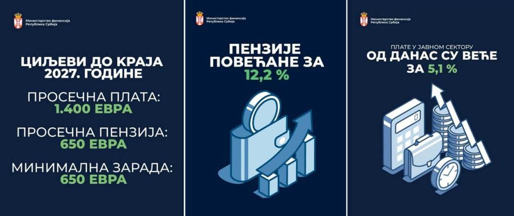 Šta je na kraju povećanja plata u 2025. godini? Povećanje plata u javnom sektoru od 5,1 odsto, u januaru 2026. godine – eto šta je na kraju povećanja plata iz 2025. godine! Od 1. januara 2026. godine je nastupilo povećanje plata u javnom sektoru od 5,1 odsto. U toku 2025. godine, plata u prosveti je porasla za 28,6 odsto, u zdravstvu je uvećana za 19,2 odsto, a u visokom obrazovanju su 16 odsto veće plate. Prosečna zarada u septembru 2025. iznosila je 931 evro, dok je krajem decembra 2025. prosečna zarada premašila planiranih 1.000 evra. Planom „Skok u budućnost“ predviđeno je da prosečna plata krajem 2027. godine bude 1.400 evra.