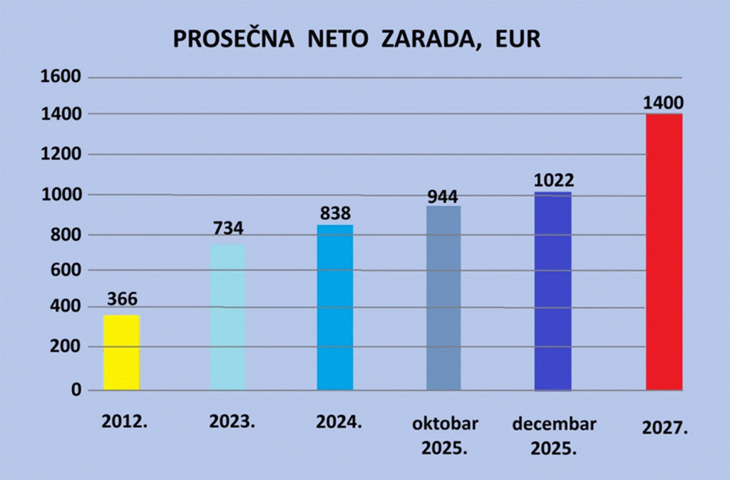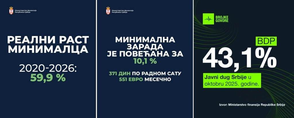 Minimalna zarada je 2025. vanredno povećana na 500 evra. Setimo se da je 2010. godine, u vreme kada je na vlasti bila sadašnja opozicija, minimalna zarada bila sramnih 155 evra. U januaru 2026., sledi redovno povećanje minimalca, kada će on dostići nivo od 551 evra. U vreme kada je na vlasti bila sadašnja opozicija, 400.000 ljudi je primalo minimalnu zaradu. Krajem 2025. godine samo 91.000 zaposlenih prima minimalnu zaradu. Broj ljudi koji prima minimalac će i dalje padati. Do kraja 2027. ili do početka 2028. godine, minimalna zarada če iznositi 650 evra. Setimo se da je 2012. godine, u vreme kada je na vlasti bila sadašnja opozicija, minimalna zarada pokrivala samo 27 odsto potrošačke korpe. Krajem 2025. minimalna zarada pokriva čak 65 odsto potrošačke korpe. Setimo se da se 2012. godine, u vreme kada je na vlasti bila sadašnja opozicija, za iznos minimalne zarade moglo kupiti samo 112 litara goriva, a krajem 2025. se moglo kupiti 346 litara goriva. Takođe, 2012. godine, u vreme kada je na vlasti bila sadašnja opozicija, za iznos minimalne zarade mogli ste da kupite samo 31 kilogram mesa, a krajem 2025. možete kupiti 90 kilograma mesa.