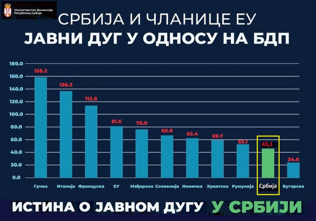 Opozicija se zbog našeg niskog javnog duga, najčešće služi obmanama kada govori samo o apsolutnom iznosu javnog duga – koji je sekundarna i ne previše bitna stvar. Opozicija govori primitivnu neistinu da je Srbija prezadužena. Važan i istinit je samo odnos javnog duga prema BDP-u, jer jedino taj podatak govori o održivosti javnih finansija, zbog toga što pokazuje koliki je dug u odnosu na kapacitet zemlje da ga servisira. Jedino odnos javnog duga prema BDP-u pokazuje snagu i veličinu srpske ekonomije. A taj odnos je izvanredan. Najbolja potvrda za to je i investicioni kreditni rejting koji je Republika Srbija dobila po prvi put u istoriji.