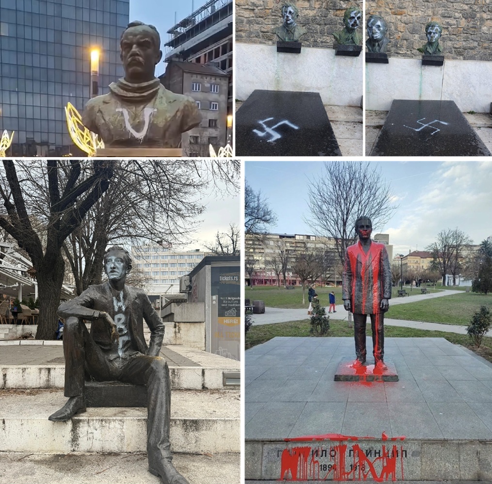 Redovna je i grozna pojava da srpska groblja i spomenike skrnave Hrvati u Hrvatskoj i Albanci na Kosovu i Metohiji. Nažalost, poslednjih godina skrnavljenje spomenika i grobova u užoj Srbiji, praktikuju opozicija i blokaderi. Setimo se da je narativ opozicije, njenih lidera, npr. Sergeja Trfunovića, bivšeg predsednika PSG, bila pretnja da će urinirati po grobovima neistomišljenika, o čemu je Trifunović govorio na mitinzima opozicije 2017. i na Tviteru. Potom su od 2019. godine, više puta vandalizovani različiti spomenici i grobnice, u Beogradu. Najviše puta je skrnavljen spomenik – „Grobnica narodnih heroja“ na Kalemegdanu. Vandali su skrnavili ovaj spomenik 5 puta. Od kada je otkriven, 2021., spomenik Stefanu Nemanji je vandalizovan 4 puta. Skrnavljeni su i drugi spomenici. Nažalost, 24.1.2026. dogodila se prava epidemija skrnavljenja spomenika u centru Beograda. Oskrnavljeno je 7 spomenika. Jedan slučaj je razotkrio ko su počinioci, i ukazao je ko bi mogli biti ostali skrnavitelji. Takođe tog 24.1.2026. je održan celodnevni skup na Trgu Nikole Pašića pod nazivom „Zajedno za studente“ u organizaciji „IT Blokade“, „Zborova građana“ i drugih udruženja koja su podržala studente. Skup je završen u 18 časova. Posle toga su satima uklanjani šatori, štandovi i ostala oprema. Tokom i posle tog skupa, pripadnici blokaderskog pokreta su vandalizovali spomenike. Prvo je tokom dana, vandalizovan spomenik Gavrilu Principu, koji se nalazi u Finansijskom parku. Spomenik Principu su oskrnavile dve levo liberalne blokaderke, studentkinje A.P. (24) i M.T. (25), članice NVO Inicijativa mladih za ljudska prava i članice grupe Aktivni studenti u blokadi. Njih dve su svoj vandalski čin same slikale, sa sve selfijem, i pohvalile se skrnavljenjem tog spomenika. Prosule su više litara crvene farbe po spomeniku. Spomenik Principu su 2015. otkrili Tomislav Nikolić i Milorad Dodik.