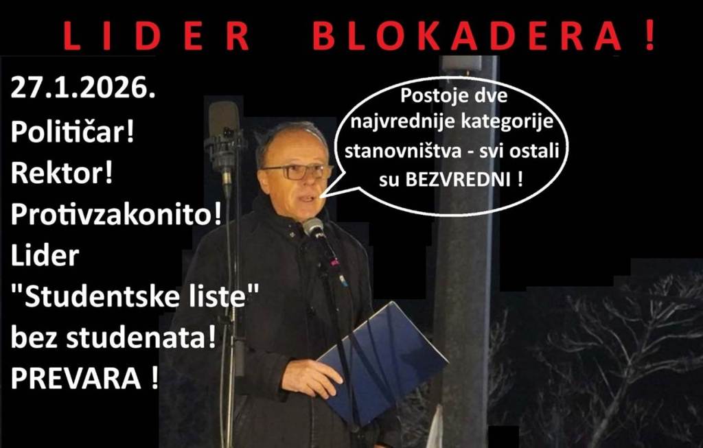 Najoštrije osuđujem nacistički narativ rektora Đokića! Đokić je govorio kao novi firer, kao Lider blokadera! Grozno je da rektor Đokić, reinterpretira i propagira nacističku teoriju o nadljudima (najvrednije kategorije stanovništva) i podljudima (bezvredne kategorije stanovništva). Nacistički narativ rektora Đokića je izrečen na prvom predizbornom skupu njegove protivzakonite, neregistrovane partije „Studenti u blokadi – Studentska lista“, 27.1.2026. ispred Rektorata. Đokić je rekao da postoje „dve najvrednije kategorije stanovništva“. To po Đokiću znači da su ostali bezvredni! Ako usvojimo Đokićev nacistički narativ da postoje najvrednije kategorije stanovništva, onda znači i da postoje one manje vredne kategorije stanovništva. To znači i da postoje bezvredne kategorije stanovništva. To znači da postoje nadljudi (najvrednije kategorije stanovništva) i podljudi (bezvredne kategorije stanovništva). Ako usvojimo Đokićev nacistički narativ da postoje najvrednije kategorije stanovništva, onda te kategorije stanovništva imaju veća prava, od kategorija stanovništva koje nisu najvrednije, koje imaju manja prava od najvrednije kategorije stanovništva. To znači da rektor Đokić propagira nejednakost u građanskim i ljudskim pravima. Zanimljivo bi bilo čuti šta o ovome imaju da kažu blokaderske NVO za ljudska prava.