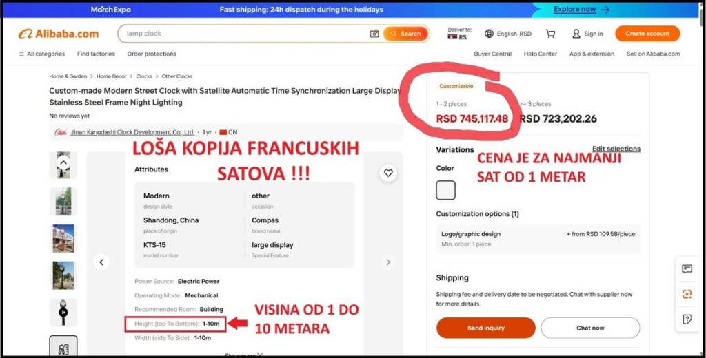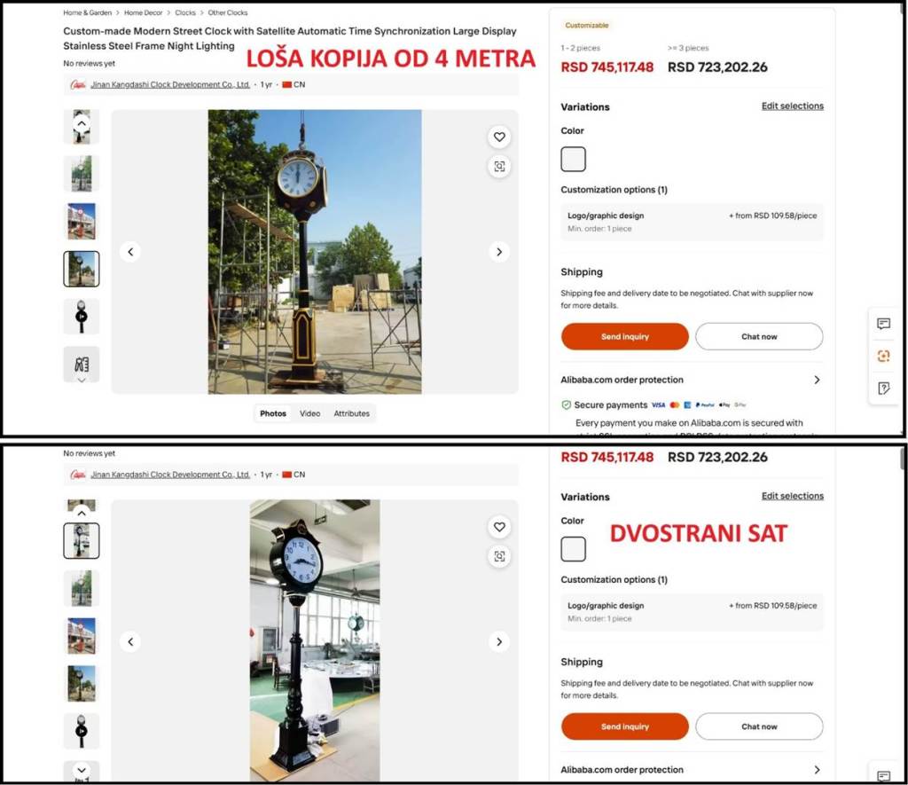 Kada uđete na link ka Alibabi koji nudi AliSava Manojlović, vidite o kakvoj prevari Manojlovića se radi. Decenijama je poznato da Kinezi prave kopije svega i svačega. U ovom slučaju Kinezi na Alibabi nude jeftine kopije francuskih uličnih satova. Kada pogladate tehničke specifikacije satova na linku koji daje Manojlović, vidi se ključni podatak – kineski satovi se proizvode u veličini-visini od 1 metar do 10 metara. Cena koju prikazuje Manojlović se odnosi na najjeftiniju varijantu sata – sat visok 1 metar, dvostran, a ne četvorostran, sa kineskim mehanizmom. Lepo stoji na Alibabi da se satovi rade u mnogo varijanti, po narudžbi i po želji, različitih visina, različitog broja strana, i od raznih materijala. Drugo, cena za sat slične veličine kao Beogradski sat, ali bez postamenta, je 10 puta veća od 6.600 dolara. Ta cena biva još veća ako kupac odabere četvorostrani, a ne dvostrani sat. Potom cena raste, ako odaberete čelik i oblogu od mesinga, koju Kinezi i nemaju, kao što ne nude izgradnju postamenta. I opet, ako naručite sat od 7 metara, dobijate loš i nebezbedan proizvod.
