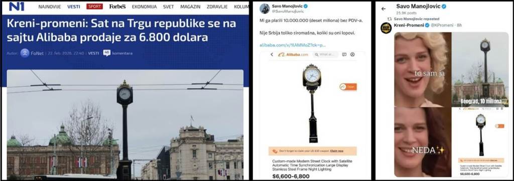 U nedostatku ideja, programa, bilo čega, bednici iz opozicije su prinuđeni da se služe smešnim obmanama, spinovima, i jeftinim, lako proverivim lažima. Tako je juče, 22.2.2026. AlibabaSava Manojlović, lider Kreni Promeni, lansirao detinjastu laž da novi simbol Beograda, „Beogradski sat“ može da se kupi na sajtu „Alibaba“ za 6800 dolara.