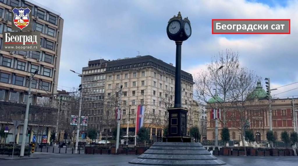 Da podsetim, takođe juče, je na kružnom toku na Trgu republike postavljen novi Beogradski sat. U pitanju je novi simbol Beograda. Beogradski sat je visok devet metara (2 metra postamenta i 7 metara sata sa stubom) i težak je sedam i po tona (sa postamentom). Sat ima kvalitetni francuski mehanizam kupljen od renomirane francuske kompanije „Bode“ (Bodet), koji radi na struju i samostalno podešava vreme preko sistema GPS za letnje i zimsko računanje vremena. Sat precizno pokazuje vreme, bez potrebe za ručnim podešavanjem i uvek će pokazivati tačno vreme. Konstrukcija (stub) sata je čelična, a oko stuba se nalazi oplata od livenog mesinga, što garantuje izuzetno dug, neograničen vek trajanja. Sat poseduje i unutrašnje i spoljno osvetljenje. Stub sata je izlila i konstruisala renomirana „Livnica Jeremić“.