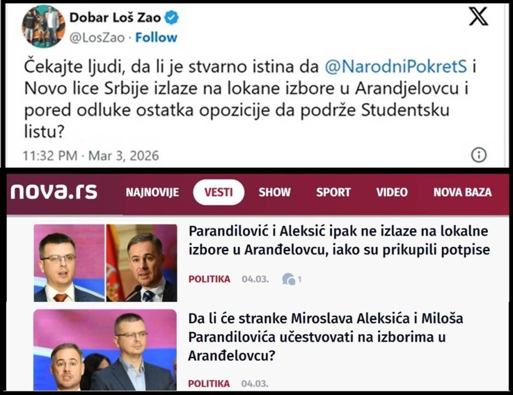 NovaS je 04.03.2026., prepodne, objavila tekst pod naslovom: „Da li će stranke Miroslava Aleksića i Miloša Parandilovića učestvovati na izborima u Aranđelovcu?“. U tom tekstu stoji: „Danas pada odluka da li će Narodni pokret Srbije Miroslava Aleksića i Novo lice Srbije Miloša Parandilovića izaći na lokalne izbore u Aranđelovcu. U javnosti su se pojavile informacije da će Narodni pokret Srbije Miroslava Aleksića i Novo lice Miloša Parandilovića izaći zajedno na lokalne izbore u Aranđelovcu, što odstupa od odluke ostatka opozicije koja je odlučila da na istim ne učestvuje, podržavajući studentsku listu. „Mi smo potpise počeli da skupljamo i pre nego što se pojavila ova lista. Da li ćemo na kraju izaći ili ćemo odustati u koristi studenata, danas ćemo odlučiti“, kaže Parandilović za NovaS“.