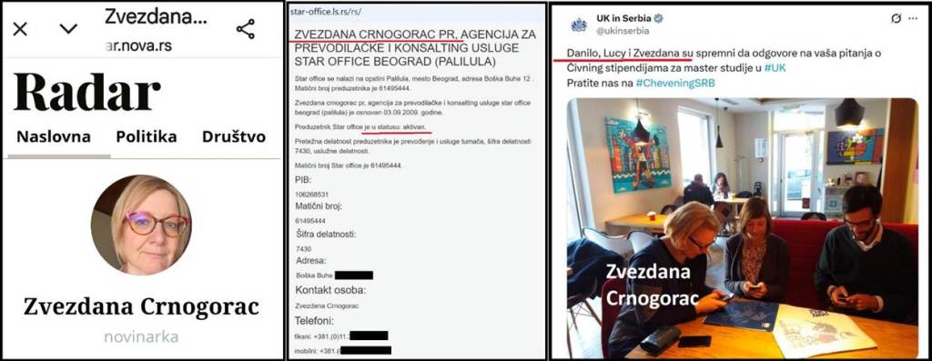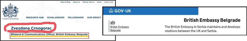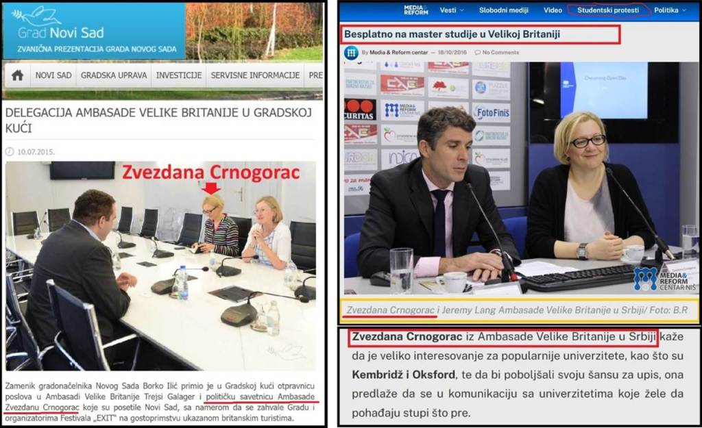 Zvezdana Crnogorac je deset godina bila službenica Ambasade Velike Britanije (politički savetnik). Sada je „novinar“ propalog lista Radar. Vlasnica je i PR agencije. Zvezdana Crnogorac je juče 4.3.2026. i danas 5.3.2026. bila u Aranđelovcu, sa visokim oficirom Ambasade Velike Britanije. Razlog – doneli su pomoć lažnoj „Studentskoj listi“ i ucenili su stranke Miroslava Aleksića (NPS) i Miloša Parandilovića (NLS) da ne predaju već prikupljene potpise za njihovu listu, tj. „nagovorili“ su NPS i NLS da ne izlaze na izbore. Postoji jasan snimak visokog oficira Ambasade Velike Britanije, Zvezdane Crnogorac i Milorada Savića, predsednika odbora Ponoševe stranke Srbija Centar.
