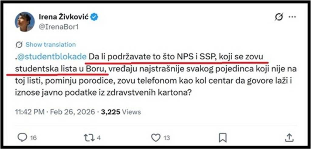 Irena Živković se putem svom naloga na „X“ platformi obratila nalogu studenada u blokadi i upitala ih da li podržavaju to što nasilnici zovu sve ljude koji nisu za njih, prete im i maltretiraju njihove porodice. „Da li podržavate to što NPS i SSP, koji se zovu studentska lista u Boru, vređaju najstrašnije svakog pojedinca koji nije na toj listi, pominju porodice, zovu telefonom kao kol centar da govore laži i iznose javno podatke iz zdravstvenih kartona?“, glasi njena objava. Poslanica Irena Živković je ovim jasno potvrdila da iza „Studentske liste“ u Boru stoje Dragan Đilas i Miroslav Aleksić, tj. SSP i NPS, a ne studenti ili neke ličnosti koje su delegirali studenti.