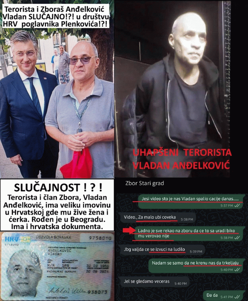 Video snimak teroriste Vladana Anđelkovića sa hrvatskim poglavnikom Plenkovićem, je nastao u Rijeci, u Hrvatskoj, snimak je snimio 9. juna 2025. hrvatski ministar Davor Filipović. Vladan Anđelković ima kuću u Rijeci, gde mu žive supruga i ćerka. Terorista Vladan Anđelković, je iz Hrvatske ušao u Srbiju 17. oktobra 2025., pet dana pre izvršenja niza krivičnih dela i akta terorizma. Vladan Anđelković ima hrvatska dokumenta, i omiljeni je terorista poglavnika Plenkovića, pored onih 6 terorista koji su u martu 2025. pobegli u Hrvatsku. Kada sve ovo znamo, urnebesno je smešna izjava Plenkovića:“Nemamo nikakav interes kao država baviti se unutarnjim pitanjima Srbije, a još manje biti nekakav lutkar iza scene koji povlači konce i organizira prosvjede. Takve teze ne stoje i one su u potpunosti izmišljene“.