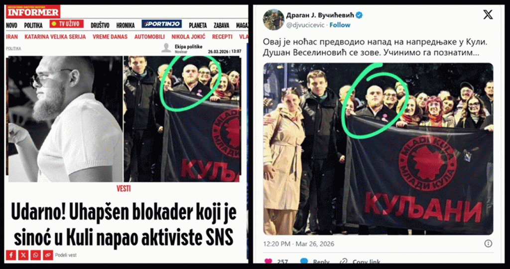 Treći slučaj – nasilje. Tokom noći, oko 02:45 časova, 26.3.2026., grupa od 20 blokadera nasilnika, koji podržavaju „Studentsku listu“ u Kuli, je fizički napala trojicu aktivista SNS u Kuli. Šolakovi mediji su kao po komandi žrtve iz SNS proglasili napadačima, a napadače i dželate blokadere su proglasili žrtvama. Srećom policija je utvrdila istinu. MUP je priveo blokadere koji su napali aktiviste SNS u Kuli. Tužilaštvo je utvrdilo postojanje teškog krivičnog dela.
