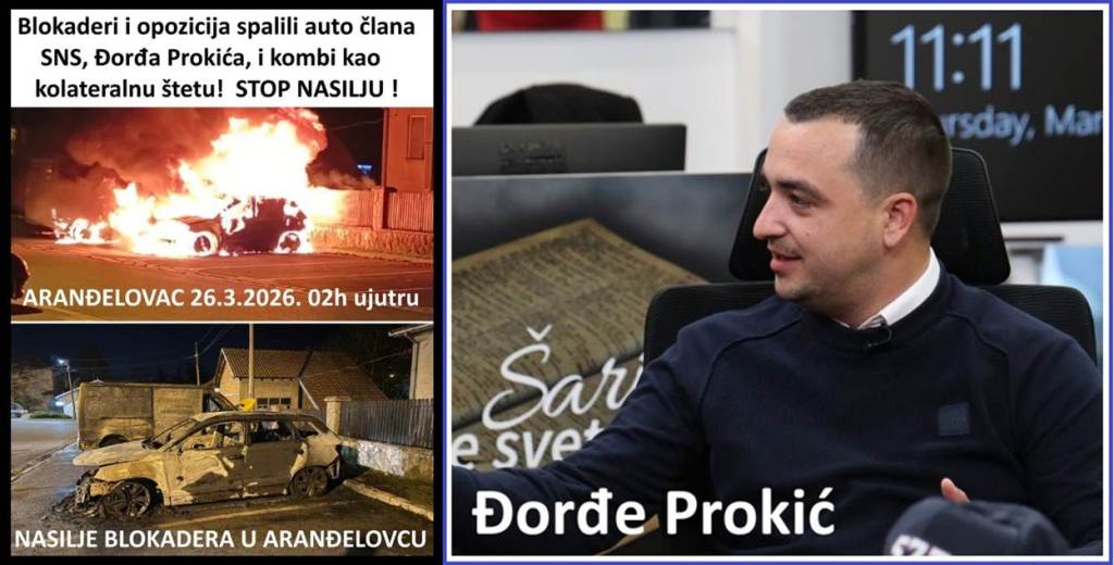 Drugi slučaj – teror. Tokom noći između 25. i 26.3.2026. blokaderi i opozicija, su u Aranđelovcu, zapalili i potpuno uništili parkirani porodični automobil Đorđa Prokića, člana SNS i direktora Turističke organizacije Aranđelovac. Uz to, kao kolateralna šteta stradao je i kombi nepoznatog vlasnika, parkiran pored vozila Đorđa Prokića. Srećom, niko nije stradao u eksploziji i požaru. Ovde se radi o čistom teroru blokadera i opozicije, i o nizu njihovih teških krivičnih dela. Prokić je mlad, stručan i miran čovek, koji nema neprijatelje. Kaže da je u poslednjim mesecima bio izložen pretnjama od strane blokadera i opozicije, samo zbog toga što je član SNS. Setimo se, u februaru su blokaderi u Aranđelovcu fizički napali člana SNS, Vladimira Marjanovića u selu Darosava, kome su naneli teške telesne povrede oka. Đorđe Prokić je povodom uništenja automobila i terora rekao za Informer, sledeće: „Ostavio sam auto na javnom parkingu jer se trenutno kod moje kuće radi put, pa nisam bio u mogućnosti da parkiram u svojoj garaži. Baš danas je trebalo da se završi rekonstrukcija i trebalo je da svoje vozilo dovezem kući, ali eto… Nikada me nisu uplašili, ali jedino sam zabrinut za svoju porodicu. MUP mi je obećao da će mi čuvati porodicu, mnogo su potreseni svi. Spreman sam i da sklonim roditelje na neko vreme, ali ću samo nastaviti da se borim. Ljudi koji ovo rade i koji ovako razmišljaju, verujte mi, više nikada neće moći da vladaju u našem gradu. Njihova politika je politika zastrašivanja. U poslednjih godinu i po dana mi intenzivno prete, a vidim da se isto dešava i u drugim mestima, Kuli i u drugima, gde će se u nedelju održati lokalni izbori“. Blokaderski mediji uopšte nisu objavili vest o teroru i nasilju nad članom SNS, Đorđem Prokićem u Aranđelovcu.