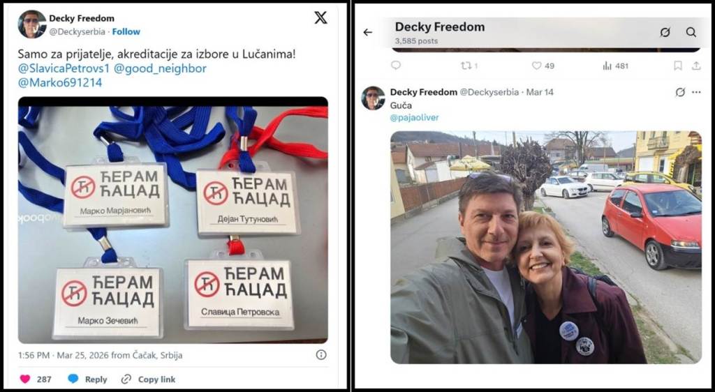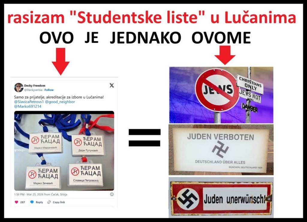 Prvi slučaj – rasizam. su 25.3.2026. blokaderi zastupnici i pripadnici lažne „Studentske liste“ iz Lučana, predvođeni Dejanom Tutunovićem, funkcionerom DS, i prijateljem Biljane Stojković, visoke funkcionerke DS, počeli da reklamiraju i dele sramne naci rasističke posmatračke akreditacije lažne „Studentske liste“ u Lučanima. Dejan Tutunović je objavio na Iksu fotografiju tih akreditacija, na kojima stoji njegovo ime, ime Marka Marjanovića, blokadera nasilnika iz Beograda, poznatijeg kao Kristal Met Dejmon, ime blokadera Marka Zečevića i ime blokaderke Slavice Petrovske. Na rasističkim akreditacijama stoji crveni znak, precrtano, ćirilično „Ћ“ i natpis „ЋЕРАМ ЋАЦАД“. Sliku nacističkih akreditacija prati tekst na Iksu „Samo za prijatelje, akreditacije za izbore u Lučanima!SlavicaPetrovs1, good_neighbor, Marko691214“, uz poruku Dejana Tutunovića, Biljani Stojković, da i nju čeka njena akreditacija – „@pajaoliver Čekamo i tebe“. Nacistička blokaderska akreditacija sadrži rasistički i fašistički sadržaj. Prvo, termin „Ćaci“ je pogrdni izraz blokadera za sve neistomišljenike, koje oni označavaju kao podljude, kao niža i bezvredna bića. Nacistički narativ blokadera i opozicije kaže da „Ćaci“ nisu ljudi, da nisu ljudska bića, da ih treba juriti po ulicama, bacati u reke, šutirati, valjati u katran i perje i ubiti. Blokaderi za sebe kažu da su elita i nadljudi.
