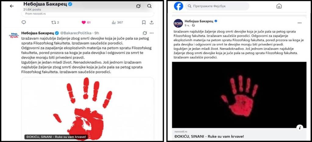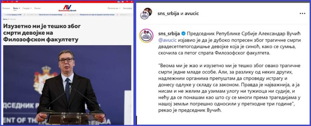 Što se mene tiče, ja sam na TV Pink, pre podne 27.3.2026. u 11h i na društvenim mrežama u 9 ujutru, izrazio najdublje žaljenje zbog smrti studentkinje Milice Živković. Izrazio sam saučešće porodici Milice Živković. Rekao sam i sledeće: „Odgovorni za zapaljenje eksplozivnih materija na petom spratu Filozofskog fakulteta, pored prozora sa koga je pala devojka i odgovorni za smrt te devojke moraju biti privedeni pravdi. Izgubljen je jedan mladi život. Nenadoknadivo“. Postavio sam nekoliko pitanja rektoru Đokiću i dekanu Sinaniju. Pitao sam ih: „Zbog čega ste protivzakonito, prostorije Rektorata i fakulteta, pretvorili u prostorije vaše političke partije „Studentska lista“ – Studenti u blokadi? Ta vaša politička partija učestvuje na izborima 29.3.2026. u 10 lokalnih samouprava!