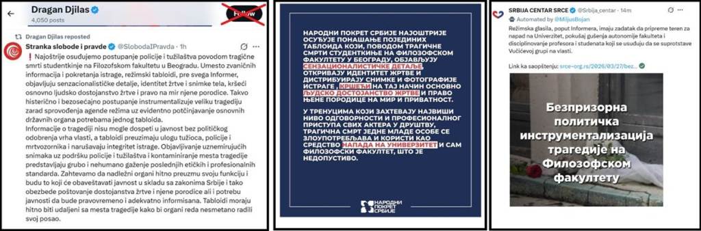 Krajnje sramno Đilasova stranka SSP, Aleksićeva stranka NPS, i Ponoševa stranka Srbija centar, su umesto da napadnu krivce za smrt Milice Živković, za tragediju optužili „režim“, policiju, tužilaštvo i pojedine medije. Lešinari iz ove tri stranke su zloupotrebili i tragediju iz 2023. godine, i tragediju iz 2024. godine. Đilasov SSP je, između ostalog, nehumano saopštio: „Najoštrije osuđujemo postupanje policije i tužilaštva povodom tragične smrti studentkinje na Filozofskom fakultetu u Beogradu. Takvo histerično i bezosećajno postupanje instrumentalizuje veliku tragediju zarad sprovođenja agende režima uz evidentno potčinjavanje osnovnih državnih organa potrebama jednog tabloida“. Ponošev SC je, između ostalog, licemerno saopštio: „Povodom nezapamćenog medijskog i političkog lešinarenja nad sinoćnom tragedijom na Filozofskom fakultetu, najoštrije osuđujemo pokušaj vrha vlasti da smrt mlade devojke iskoristi za brutalni obračun sa akademskom zajednicom. Ova bezprizorna politička instrumentalizacija stradanja studentkinje ima za cilj i da se iskoristi za političke obračune uoči lokalnih izbora…“. Aleksićev NPS je, između ostalog, neljudski saopštio: „Narodni pokret Srbije najoštrije osuđuje ponašanje pojedinih tabloida, povodom tragične smrti studentkinje na Filozofskom fakultetu u Beogradu. Tragična smrt jedne mlade osobe se zloupotrebljava i koristi kao sredstvo napada na Univerzitet i sam Filozofski fakultet, što je nedopustivo“.