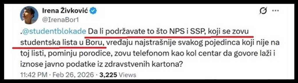Tezu da su opozicione stranke sakrivene iza „Studentskih lista“ potvrdila je 26.2.2026., narodna poslanica Sloge iz Bora, Irena Živković (bivša poslanica Đilasovog SSP), koja je putem „X“ platforme osudila nasilno ponašanje tzv. „Studentske liste“ u Boru, navodeći da iza nje stoje Dragan Đilas i Miroslav Aleksić. Ona se obratila nalogu studenada u blokadi i upitala ih:„Da li podržavate to što NPS i SSP, koji se zovu studentska lista u Boru, vređaju najstrašnije svakog pojedinca koji nije na toj listi, pominju porodice, zovu telefonom kao kol centar da govore laži i iznose javno podatke iz zdravstvenih kartona?“.