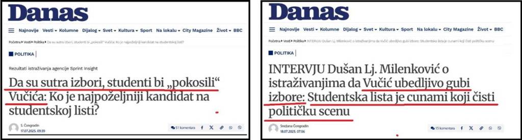 Primer 2. Antisrpski blokaderski list „Danas“ je 18.07.2025., objavio obmanjujući tekst pod naslovom: „INTERVJU Dušan Lj. Milenković o istraživanjima da Vučić ubedljivo gubi izbore: Studentska lista je cunami koji čisti političku scenu“. U tom tekstu, između ostalog stoji: „Istraživanja javnog mnjenja firme Sprint Insight, sprovedena u periodu kraj juna – početak jula, ispostavila su rezultat da bi studentska lista ubedljivo pobedila Vučićev režim, ako bi se izbori sutra održali. Razlika u procentima je veća za više od deset odsto – u korist studenata. Dušan Lj. Milenković, politički konsultant i jedan od osnivača firme koja je uradila ovo istraživanje – u razgovoru za Danas kaže da je iznenađen kojom se brzinom povećava razlika između dva ključna takmičara na političkoj sceni. – Ali, nisam iznenađen činjenicom da studentska lista ima veću podršku od pokreta Aleksandra Vučića. I naša ranija istraživanja, kao i istraživanja nekih drugih firmi nam već mesecima pokazuju trend pada podrške Vučiću, dok je poverenje u studente i njihov pokret ogromno – kaže sagovorik Danasa“. Kao što vidite, Sprint insajt i Dušan Milenković, su komično tvrdili da „studentska lista ubedljivo pobeđuje Vučićev režim sa razlikom većom od 10 odsto“!?!