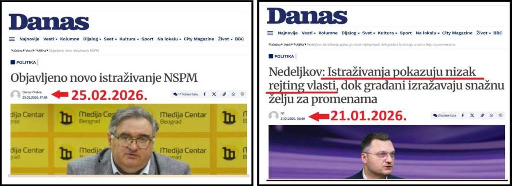 Primer 4. Antisrpski blokaderski list „Danas“ je 25.02.2026., objavio obmanjujući tekst pod naslovom: „Objavljeno novo istraživanje NSPM“. U tom tekstu, između ostalog stoji: „Prema objavljenoj tabeli, za sadašnju vlast SNS glasalo bi 35 odsto ispitanika, za zajedničku listu studenata i opozicije 41 odsto, dok je neopredeljenih 23,5 odsto“. Kao što vidite, NSPM komično tvrdi da vlast ima 35 odsto, a studenti i opozicija 41 odsto. Takođe, komično tvrdi da ima 23,5 neopredeljenih. Na izborima nema neopredeljenih. Ko izađe na izbore taj se opredelio. Oni koji ne izađu, ne računaju se. Visoka izlaznost na lokalnim izborima u 15 mesta je demantovala tvrdnju NSPM o velikom broju neopredeljenih.