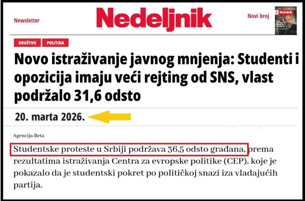 Primer 5. Antisrpski blokaderski list „Nedeljnik“ i antisrpska agencija „Beta“ su 20.03.2026., objavili obmanjujući tekst pod naslovom: „Novo istraživanje javnog mnjenja: Studenti i opozicija imaju veći rejting od SNS, vlast podržalo 31,6 odsto“. U tom tekstu, između ostalog stoji: „Studentske proteste u Srbiji podržava 36,5 odsto građana, prema rezultatima istraživanja Centra za evropske politike (CEP), koje je pokazalo da je studentski pokret po političkoj snazi iza vladajućih partija. Najveći broj ispitanika (34,6 odsto) je politički neopredeljeno ili je reklo da ne prati politiku. Kao najbližu političku opciju 31,6 odsto učesnika ispitivanja je navelo vladajuće političke partije, 23,9 odsto studentski pokret, a opozicione političke stranke 9,8 odsto. Istraživanje CEP-a, u kojem je učestvovalo 1.000 ljudi, sprovedeno je od 19. januara do 2. februara“. Ostavimo po strani idiotska neslaganja u ovom tekstu, koja su ili krivica CEP-a, ili su krivica „Nedeljnika koji je možda pogrešno preneo rezultate istraživanja CEP-a. CEP tvrdi da vlast ima 31,6% a da studente i opoziciju podržava 33,7% (23,9%+9,8%). CEP ponavlja besmislicu NSPM o velikom broju neopredeljenih. Visoka izlaznost na lokalnim izborima u 15 mesta je demantovala tvrdnju CEP o velikom broju neopredeljenih.