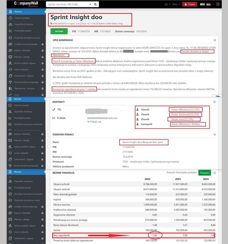 Kao što vidite, Sprint insajt i Dušan Milenković, komično tvrde da „celokupna opozicija osvaja 10,2 odsto, studentska lista 45,9 odsto, a pokret na čelu sa Aleksandrom Vučićem 41,4 odsto, a da ukoliko opozicija ne izađe na izbore studentska lista osvojila 54,8 odsto, dok bi za Vučićevu listu glasalo 42,1 odsto“. A u julu, kada su vršili istraživanje bili su poznati rezultati izbora u Zaječaru-SNS 47,95%, i u Kosjeriću SNS-50,96%. Prosečno 49,5% za SNS. I ti rezultati iz juna su demantovali istraživanje Sprint insajt iz jula. Šef Sprint insajta Dušan Milenković je ove obmane iznosio i tokom prva tri meseca 2026., kada je gostovao na N1 i NovaS. Da konstatujem da agencija Sprint Insight, praktično ne postoji. Uvidom u APR i „Company Wall“ vidi se da imaju samo jednog zaposlenog, Dušana Milenkovića, koji je istovremeno i direktor. Lažna agencija je registovana u Milenkovićevom stanu u Cvijićevoj ulici, gde se na interfon „Milenković“ javlja njegova tašta iz Hrvatske. Na zgradi i interfonu nema naziva agencije „Sprint insajt“. Domen ove lažne agencije registrovan je u Vodovodskoj ulici broj 76, ali na tom broju jedino postoji tabla ketering službe jedne beogradske kafane. Fondacija koja je navodno naručila istraživanje, „Better future for Serbia“, nije registrovana u APR-u, nema službeni sajt, tj. ne postoji!