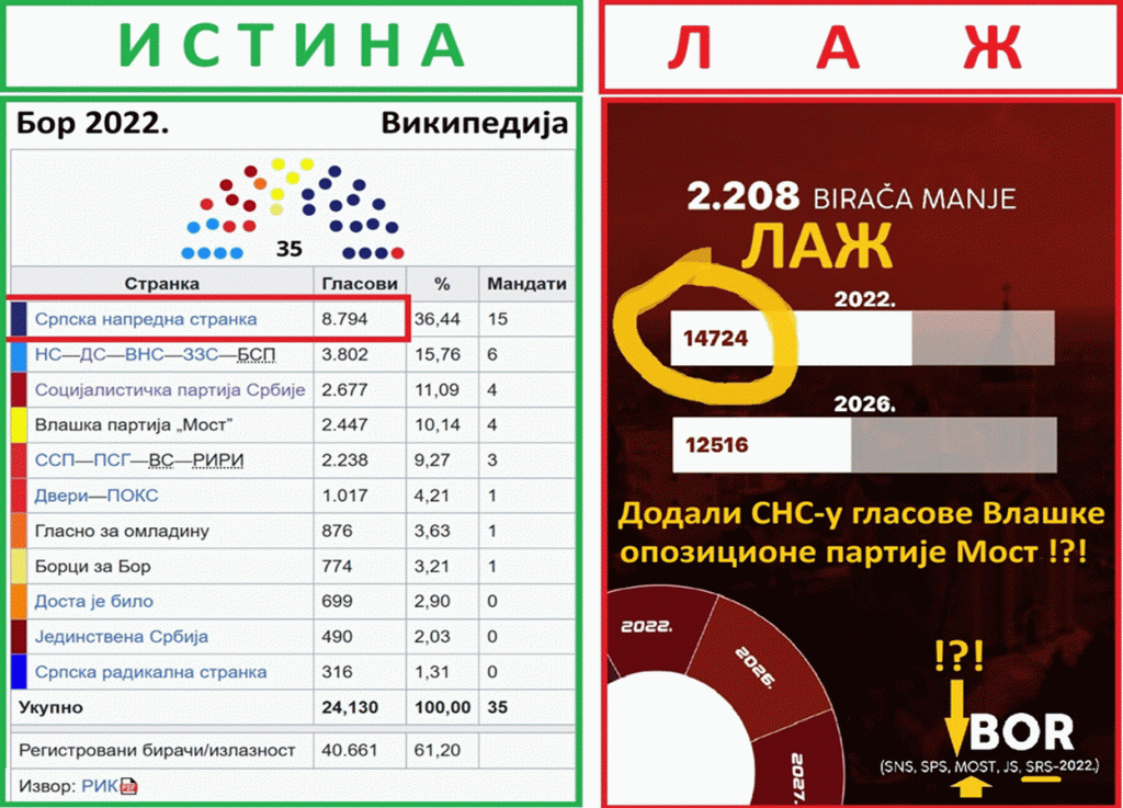 Bor. Najveća obmana blokadera FTN i NovaS se odnosi na Bor. Tu je predsednik poentirao. Blokaderi FTN i NovaS su rezultatu SNS u Boru prevarantski dodali rezultat nesumnjivo opozicione liste u Boru – liste „Vlaška partija Most“, koja je dobila 2447 glasova 2022. godine. To su bili glasovi protiv SNS. Drastična je obmana javnosti, te glasove dodati rezultatu SNS iz 2022. Tu se ne radi čak ni o sabiranju baba i žaba. Tu se radi o namernoj prevari od strane blokadera FTN, da bi pokušali da dokažu svoje laži. Pali su na ispitu. U Boru SNS 2026. godine, ima 49,22 %, a blokaderi i opozicija 42%.