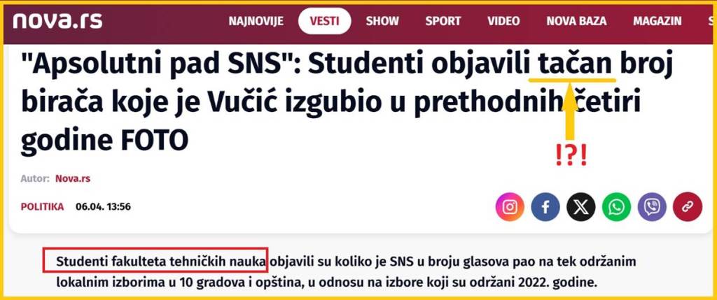 O čemu se radi? Koji je to tekst na NovaS, na čije laži je ukazao predsednik Vučić? Propali portal, propale novine NovaS je 6.4.2025. godine, objavio obmanjujući tekst pod naslovom: „„Apsolutni pad SNS“: Studenti objavili tačan broj birača koje je Vučić izgubio u prethodnih četiri godine“. NovaS prenosi lažno istraživenje studenata blokadera sa FTN Novi Sad.
